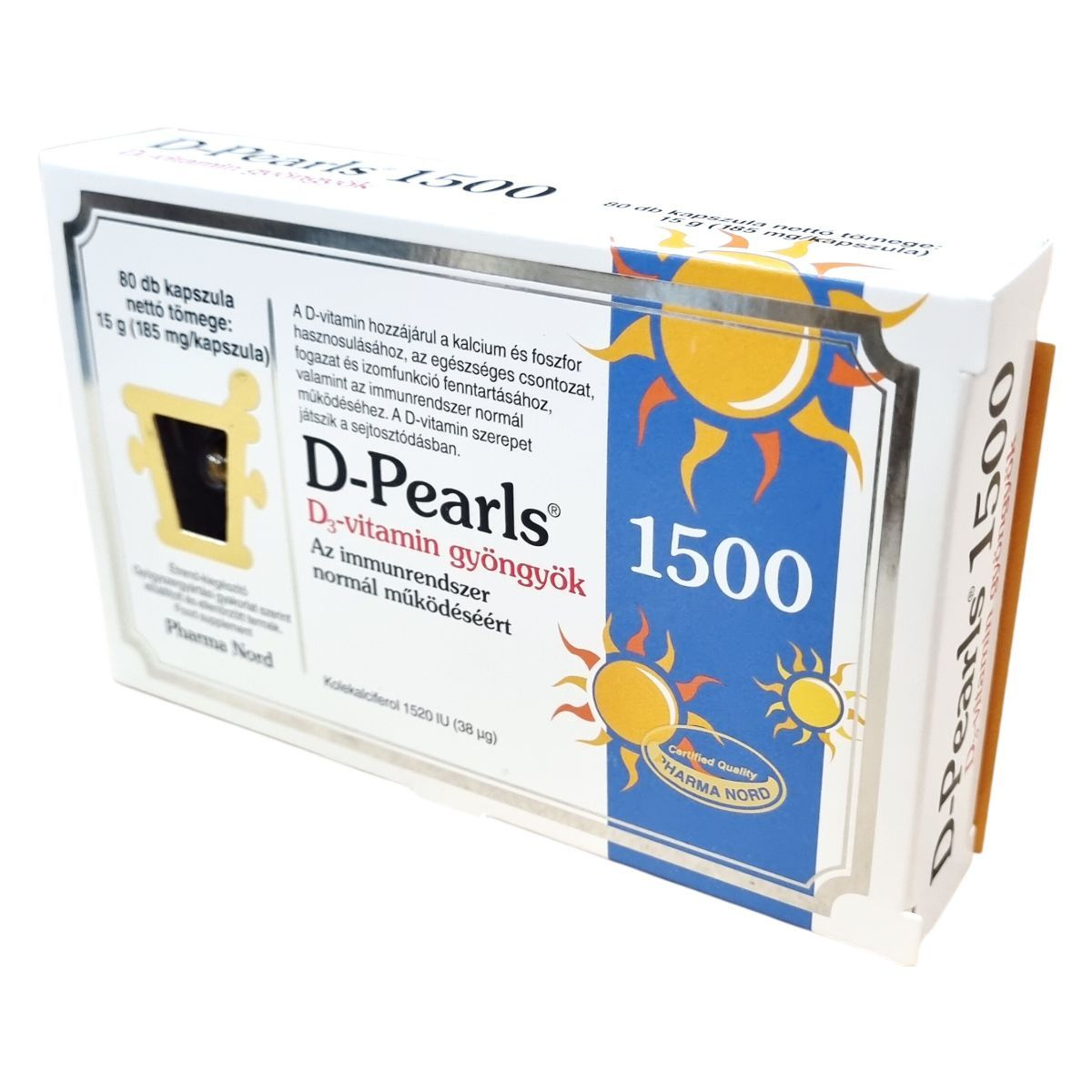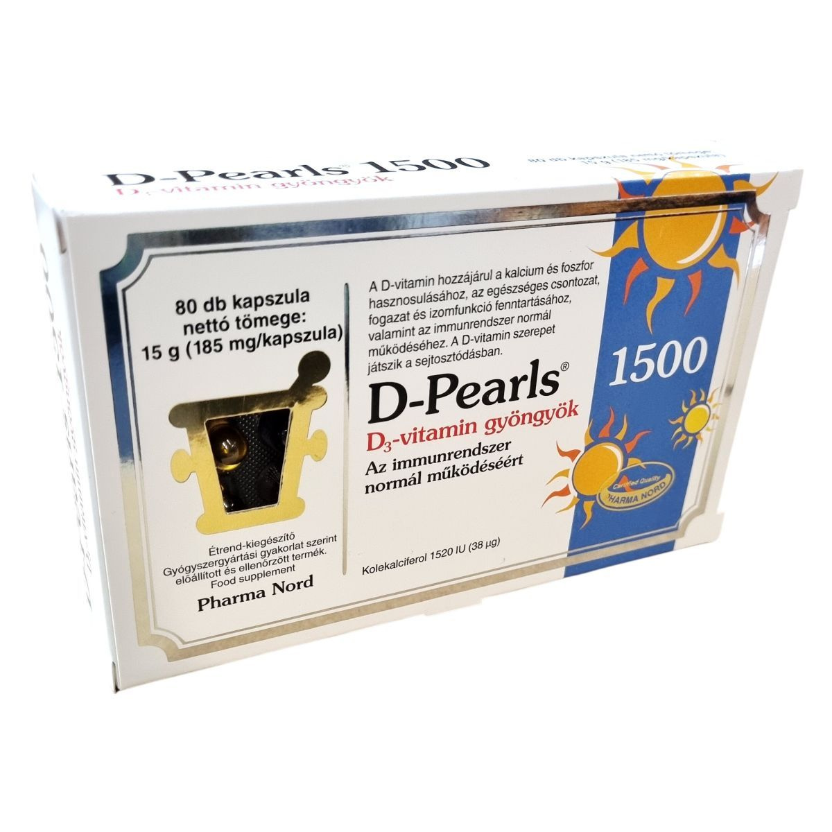A D-Pearls 1500 D₃-vitamin gyöngyök kapszulánként 38 µg D₃-vitamint tartalmaznak. A D-vitamin hozzájárul a kalcium és foszfor hasznosulásához, az egészséges csontozat, fogazat és izomfunkció fenntartásához, valamint az immunrendszer normál működéséhez. A D-vitamin szerepet játszik a sejtosztódásban.