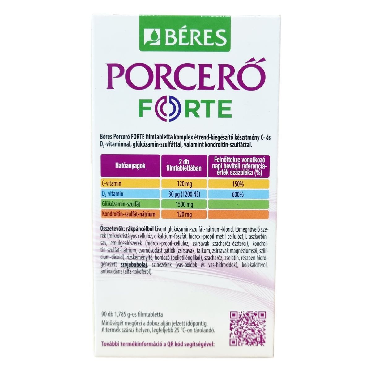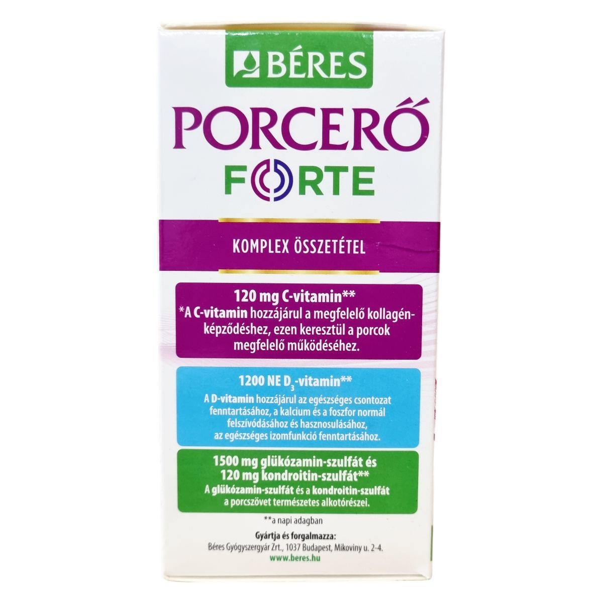 A Béres Porcerő FORTE egy komplex étrend-kiegészítő, amely C- és D3-vitamint, glükózamin-szulfátot és kondroitin-szulfátot tartalmaz. A C-vitamin hozzájárulhat a megfelelő kollagénképződéshez, ezáltal a porcok egészséges működéséhez. A D-vitamin segítheti az egészséges csontozat fenntartását, a kalcium és foszfor normál felszívódását és hasznosulását, valamint az egészséges izomfunkció megőrzését. A glükózamin-szulfát és kondroitin-szulfát a porcszövet természetes alkotórészei. A termék alkalmazása javasolt sportolóknak, idősebb felnőtteknek és időskorúaknak. A készítmény szedése legalább három hónapon keresztül ajánlott, és a napi adagot általában két részletben érdemes bevenni. A termék nem helyettesíti a kiegyensúlyozott étrendet és az egészséges életmódot. Terhes és szoptató anyák, gyermekek, véralvadásgátlót szedők, illetve bizonyos egészségügyi állapotú személyek számára nem ajánlott a fogyasztása.