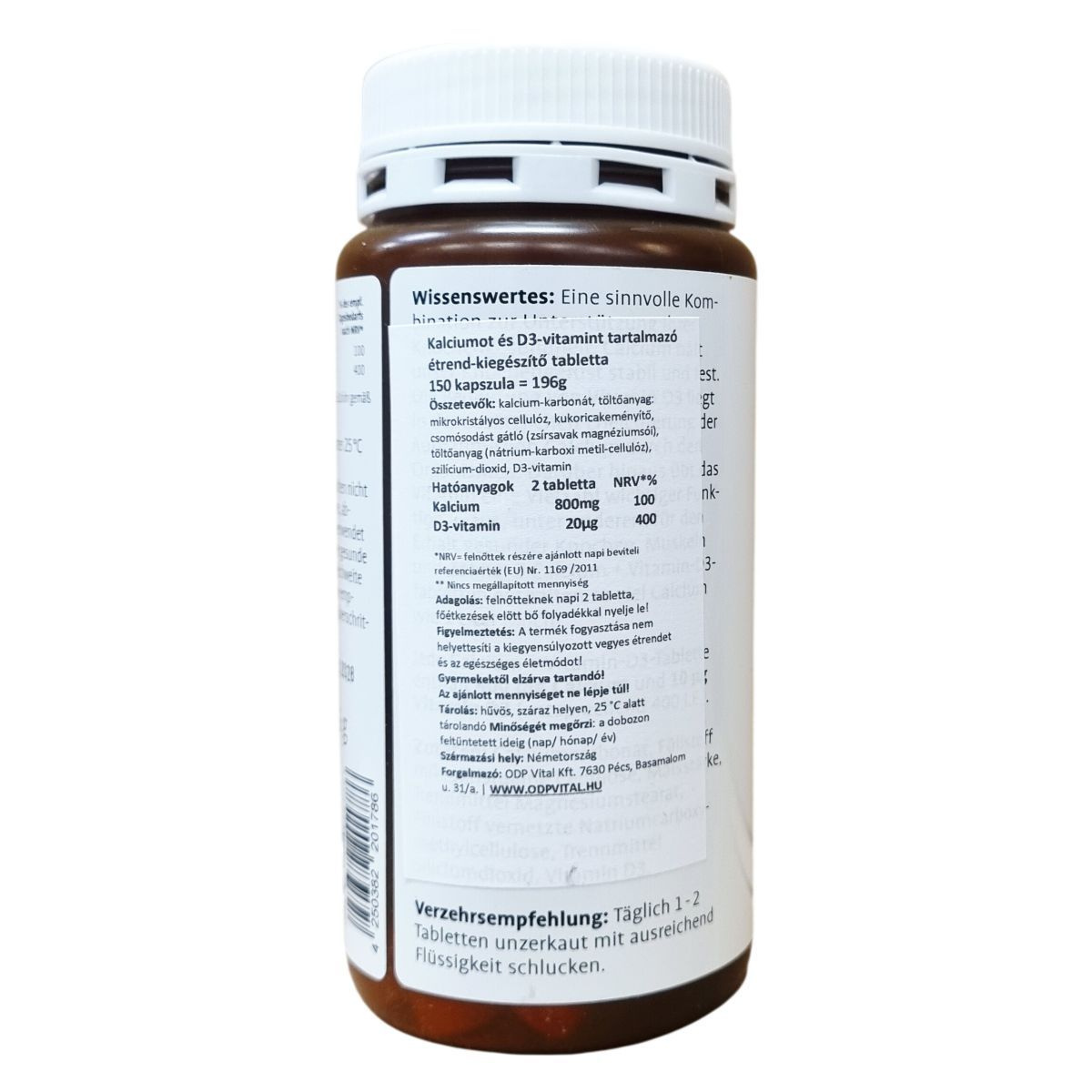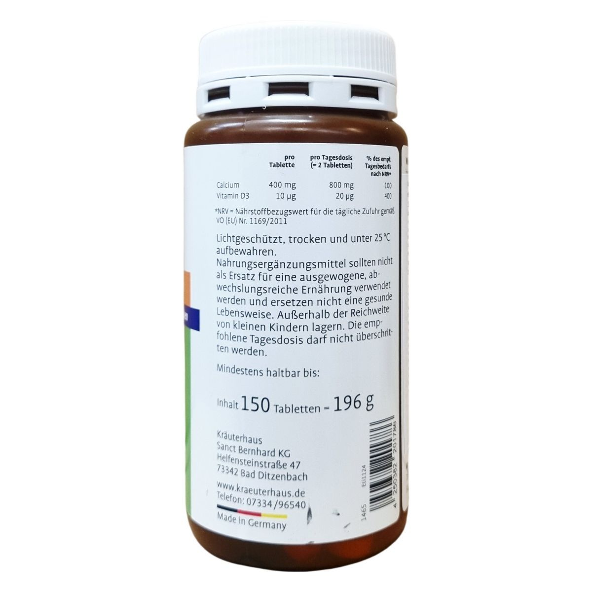 Ez a németországi eredetű étrend-kiegészítő készítmény kalciumot és D3-vitamint tartalmaz, amelyek hozzájárulhatnak a csontok egészségének megőrzéséhez. A termék 150 tablettát tartalmaz, amelynek nettó tömege 196 gramm. A készítmény összetevői között megtalálható a kalcium-karbonát, töltőanyagként mikrokristályos cellulóz és kukoricakeményítő, csomósodást gátló anyagok, valamint szilícium-dioxid és a D3-vitamin. Az ajánlott napi adag felnőttek részére 2 tabletta, melyet főétkezések előtt, bő folyadékkal célszerű bevenni. A termék fénytől védett, száraz helyen, 25 °C alatt tárolandó, és nem helyettesíti a kiegyensúlyozott étrendet és az egészséges életmódot. A doboz tartalma 150 tabletta, melyet gyermekektől elzárva kell tartani, és az ajánlott napi bevitelt nem szabad túllépni.
