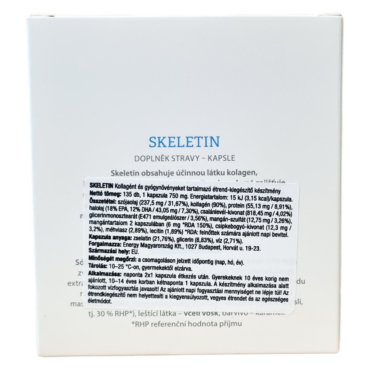 A Skeletin egy étrend-kiegészítő, amely kollagént, halolajat EPA és DHA zsírsavakkal, valamint csalánlevél- és csipkebogyó-kivonatot tartalmaz. A kapszula anyaga zselatin, glicerin és víz. A termék nettó tömege 135 kapszula, kapszulánként 750 mg. A készítményt az EU területén gyártják. Használat előtt konzultáljon egészségügyi szakemberrel, különösen terhesség és szoptatás idején, valamint allergiás reakciók esetén. Az ajánlott használat napi két kapszula étkezés után, kisgyermekek esetén az adag módosítható, és a készítmény alkalmazásakor a megnövelt folyadékbevitel javasolt. Az étrend-kiegészítő nem helyettesítheti az egészséges, változatos étrendet és életmódot.