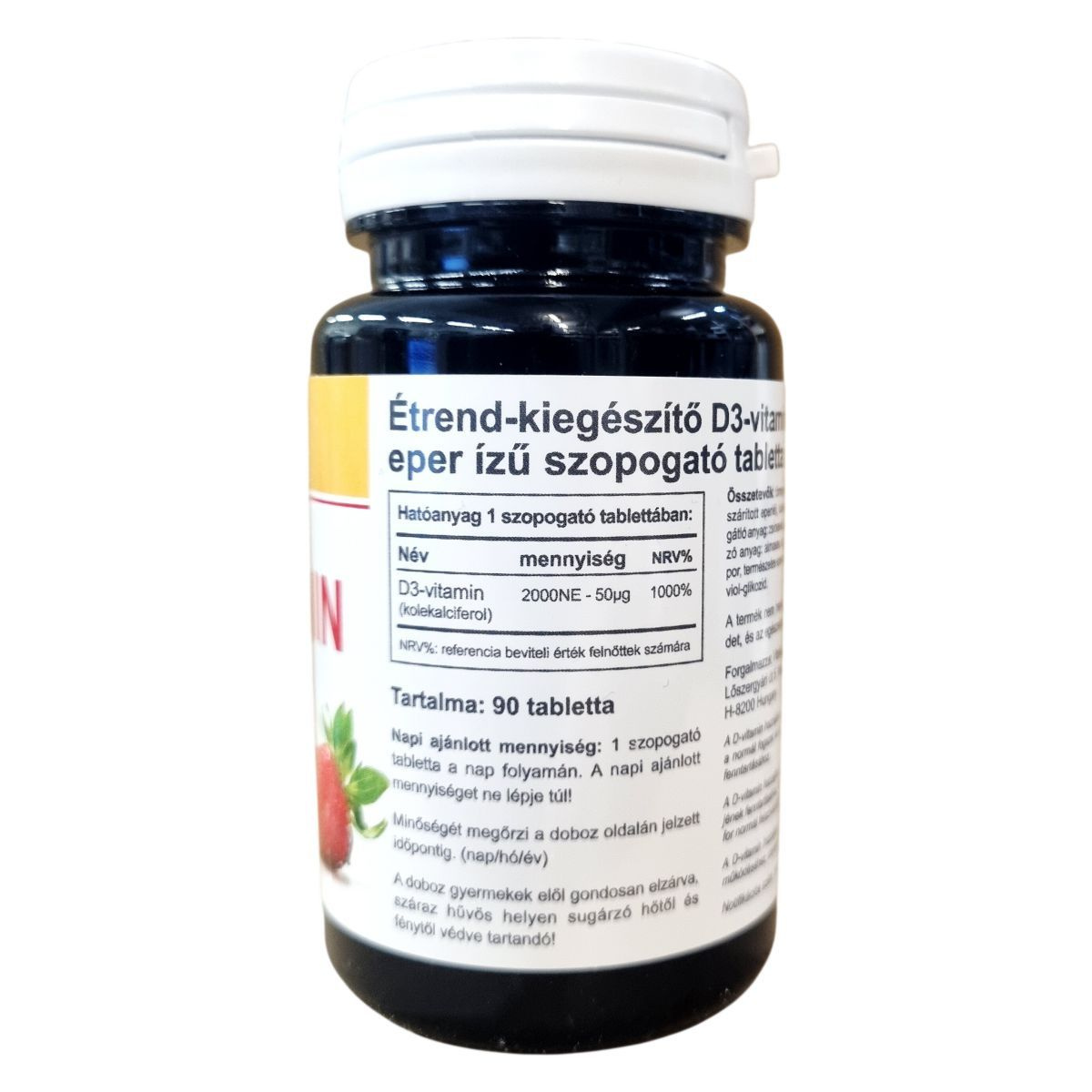 A termék természetes eper ízesítésű D3-vitamint tartalmaz, amely szopogató tabletta formájában érhető el, és hozzájárulhat az egészséges csontozat és immunrendszer támogatásához.