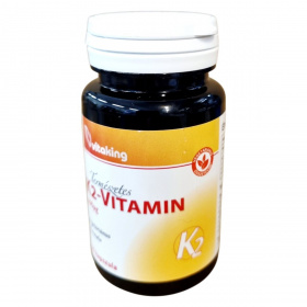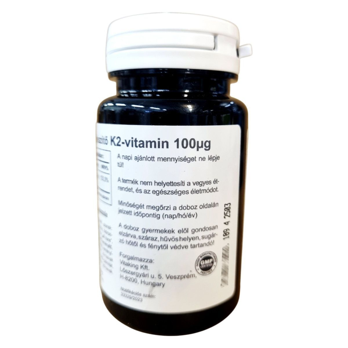 A Vitaking K2-vitamin étrend-kiegészítő 30 kapszulát tartalmaz, melyek mindegyike 100µg K2-vitamint biztosít. A termék vegetáriánus formula, amely a csontok egészségének támogatásához járulhat hozzá. A kapszulák menakinon („all trans” MK-7) formában tartalmazzák a K2-vitamint, amely a napi ajánlott beviteli érték 133,3%-át fedezheti. A termék összetevői között szerepelnek különböző tömegnövelő szerek és csomósodást gátló anyagok. A termék használata során fontos, hogy ne lépjük túl a napi ajánlott mennyiséget, és tartsuk be a tárolási előírásokat.