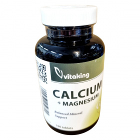 A Vitaking Calcium + Magnesium étrend-kiegészítő 100 tablettát tartalmaz, és kalciumot, valamint magnéziumot biztosít a szervezet számára. A kalcium szükséges lehet a normál csontozat és a fogak fenntartásához, míg a magnézium részt vehet a normál csontozat fenntartásában. A termék összetevői között megtalálható az osztriga kagylóhéj por, magnézium-oxid, kalcium-karbonát, valamint különböző emulgálószerek és stabilizátorok. A termék forgalmazója a Vitaking Kft., és az OGYÉI nyilvántartási száma 27252/2021.