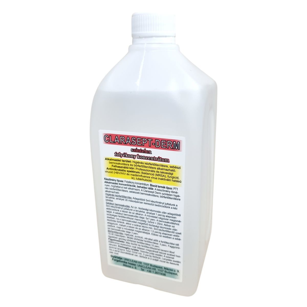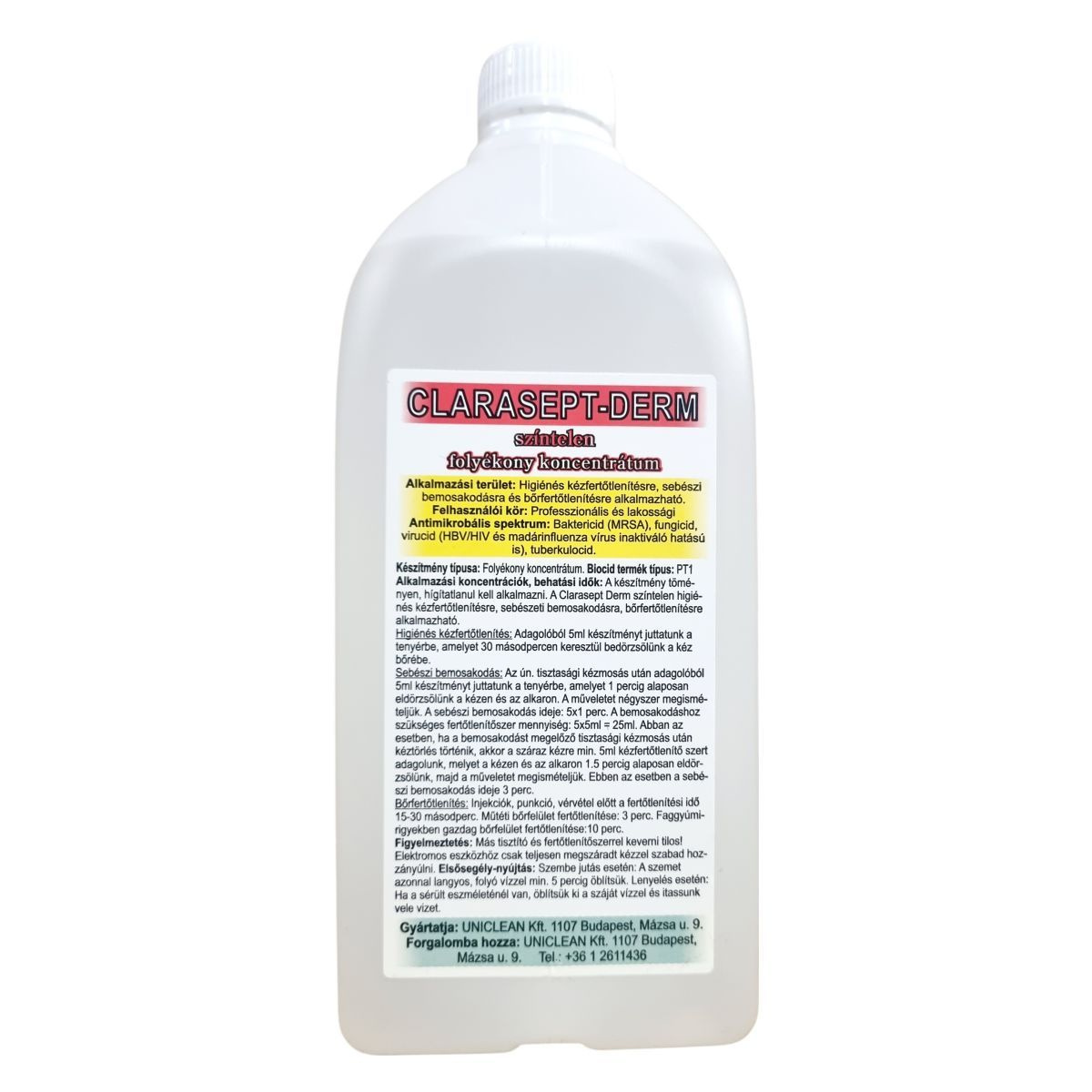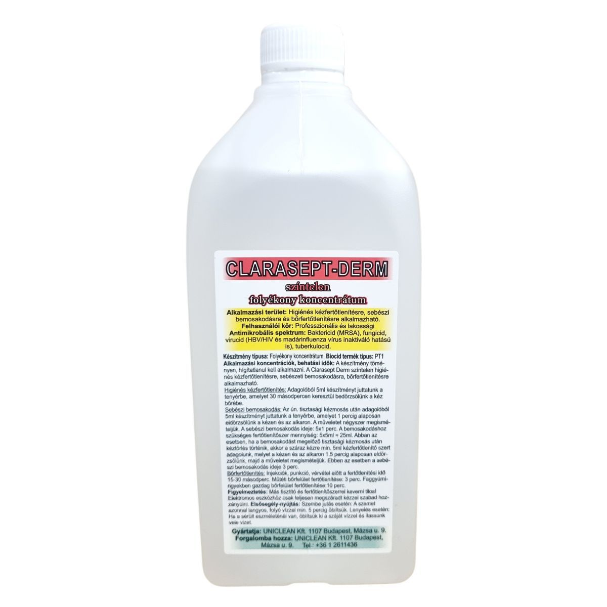 A Clarasept-Derm egy folyékony, színtelen koncentrátum, amely széleskörű antimikrobiális spektrummal rendelkezik, baktériumok (beleértve MRSA-t), gombák, vírusok (HBV, HIV és madárinfluenza vírus inaktiválására alkalmas), valamint tuberkulocid hatású. Kiemelten alkalmas higiénés kézfertőtlenítésre, sebészi kézbemosásra és bőrfertőtlenítésre. A készítmény töményen, hígítatlanul használandó, adagoló segítségével pontos alkalmazást tesz lehetővé. Fontos, hogy ne keverjük más tisztító- vagy fertőtlenítőszerrel. Használat közben az elektromos eszközök kezelése csak száraz kézzel engedélyezett. Rendkívül tűzveszélyes, ezért hőtől és nyílt lángtól távol kell tárolni, illetve használni. A szennyezett területet körülhatárolva, a kiömlött anyagot megfelelően összegyűjtve és kezelve kell eltávolítani, a maradékot bő vízzel kell feltisztítani. A hulladékot veszélyesként kell kezelni, az üres göngyöleget alaposan ki kell tisztítani újrafelhasználás vagy megsemmisítés előtt. Környezetvédelem szempontjából a terméket csak a megadott módon szabad kezelni és tárolni, tilos hígítatlanul a talajba, vízbe vagy csatornába engedni.