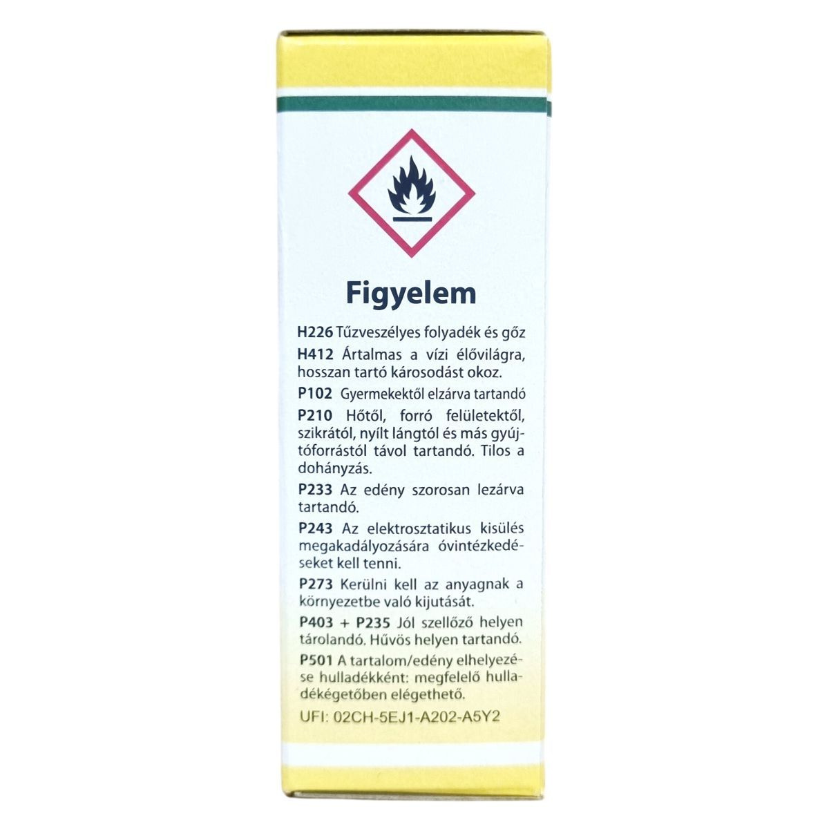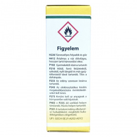 H226 Tűzveszélyes folyadék és gőz. H412 Ártalmas a vízi élővilágra, hosszan tartó károsodást okoz. P102 Gyermekektől elzárva tartandó. P210 Hőtől, forró felületektől, szikrától, nyílt lángtól és más gyújtóforrástól távol tartandó. Tilos a dohányzás. P233 Az edény szorosan lezárva tartandó. P243 Az elektrosztatikus kisülés megakadályozására óvintézkedéseket kell tenni. P273 Kerülni kell az anyagnak a környezetbe való kijutását. P403 + P235 Jól szellőző helyen tárolandó. Hűvös helyen tartandó. P501 A tartalom/edény elhelyezése hulladékként: megfelelő hulladékégetőben elégethető.
