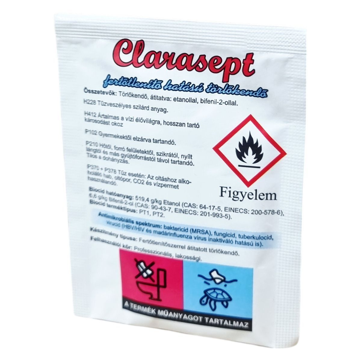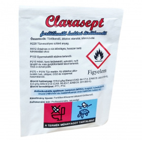 A Clarasept fertőtlenítő törlőkendő biocid terméktípus szerint PT1 és PT2-es készítmény, mely baktericid, fungicid, tuberkulocid, valamint virucid hatású, ideértve az HBV/HIV és madárinfluenza vírus inaktiválását is. A termék alkohol és bifenil-2-ol hatóanyaga révén hatékonyan alkalmas higiénés kézfertőtlenítésre, valamint eszközök és különböző felületek egyszerű és gyors fertőtlenítésére. Használata során nem szükséges víz alkalmazása, így praktikus megoldást nyújt szaniter helyiségekben vagy forgalmas közintézményekben. Elsősegély esetén, ha szembe kerül, a szemet langyos folyó vízzel legalább 5 percig ki kell öblíteni, és szükség esetén orvosi segítséget kell kérni. A készítmény műanyagot tartalmaz, ezért használat után a hulladékot megfelelően kell kezelni, nem juttatható élővízbe, közcsatornába vagy talajba. Kizárólag az eredeti, bontatlan csomagolásban, száraz, hűvös helyen őrizze meg hatékonyságát.