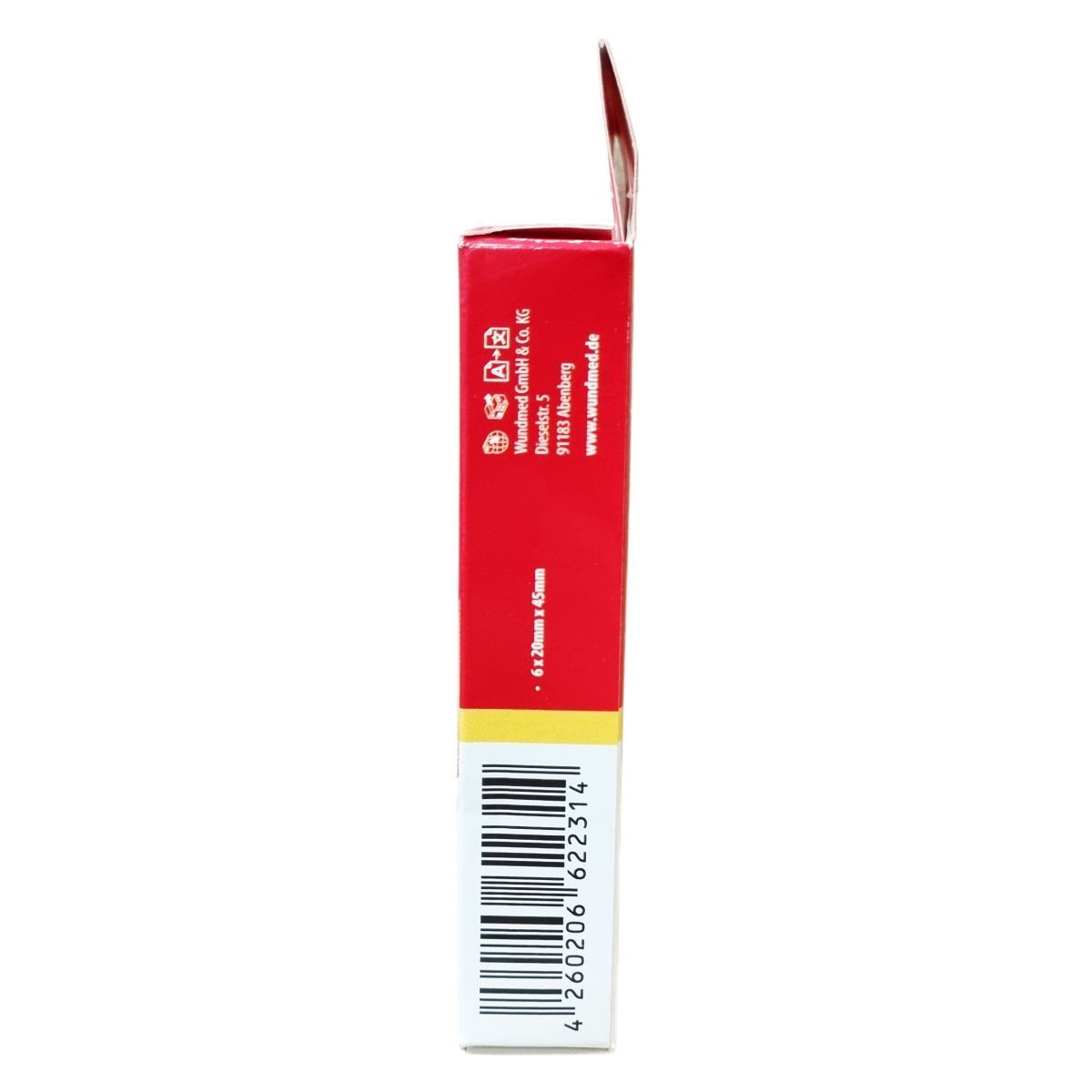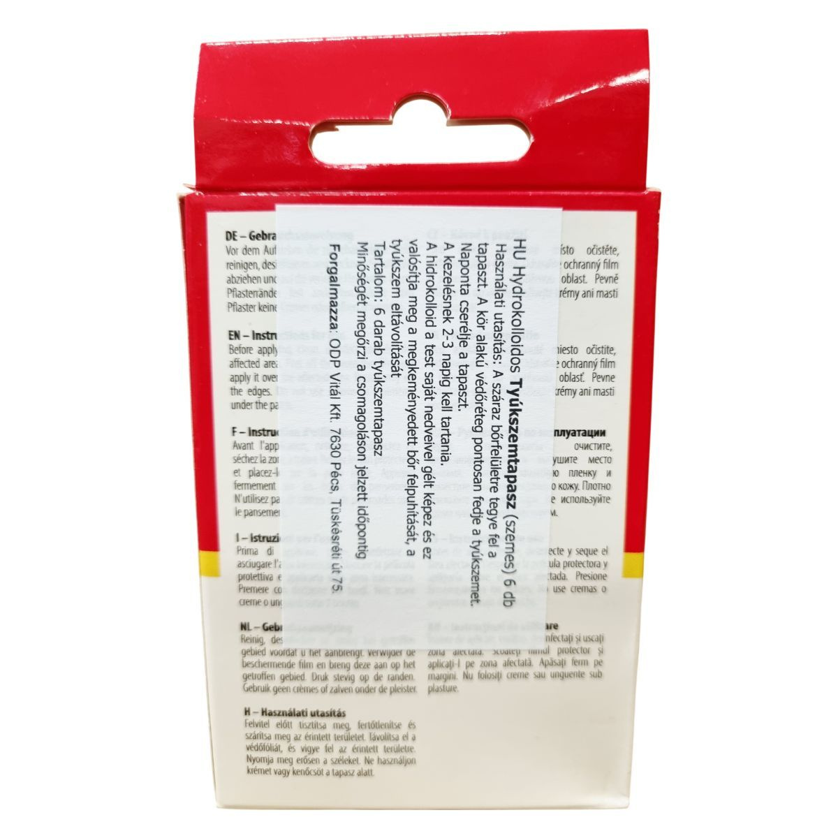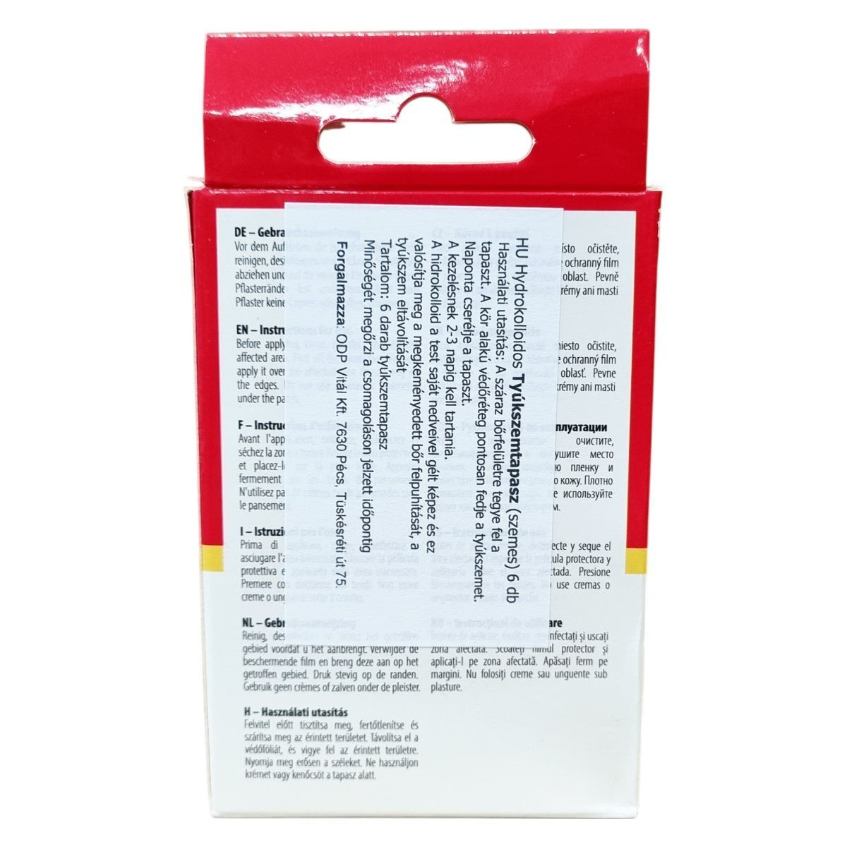 A WUNDmed® Hydrokolloidos Tyúkszemtapasz hatékony segítséget nyújt a tyúkszem kezelésében. A hidrokolloid réteg a test saját nedvével gélt képez, amely felpuhítja a megkeményedett bőrt és elősegíti a tyúkszem eltávolítását. A tapasz vízálló és antibakteriális tulajdonságokkal rendelkezik, ami javítja a használat kényelmét és higiénikus maradást biztosít. A termék kiszerelése 6 darab, mérete 20 mm x 45 mm. A csomagolás a minőség megőrzésének időpontját tartalmazza, a terméket a megfelelő gyártási és forgalmazási adatokat feltüntetve biztosítják.