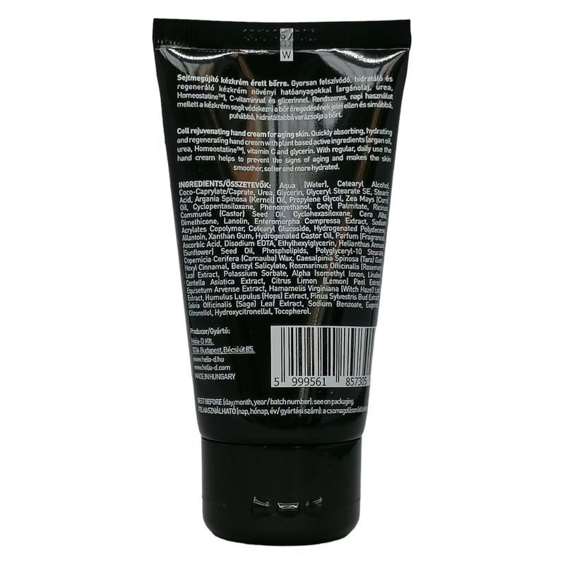 Gyorsan felszívódó, hidratáló és regeneráló kézkrém növényi hatóanyagokkal (argán olaj, urea, Homeostatine) és C-vitaminnal. Rendszeres, napi használat mellett a kézkrém segít védekezni a bőr öregedésének jelei ellen és simábbá, puhábbá varázsolja a bőrt. Az urea a bőr felső rétegében is megtalálható szerves hidratáló anyag, amelynek kimagasló szerepe van a nedvességszint folyamatos fenntartásában. A száraz, vízhiányos bőrben a koncentrációja kb. fele akkora, mint a normál bőrben. Ráadásul az urea is azon alkotórészek közé tartozik, amelynek a szintje az életkorral is csökken. További érdekes tulajdonsága, hogy csökkenti a viszkető érzést és elősegíti az ápoló anyagok bejutását a bőrbe.