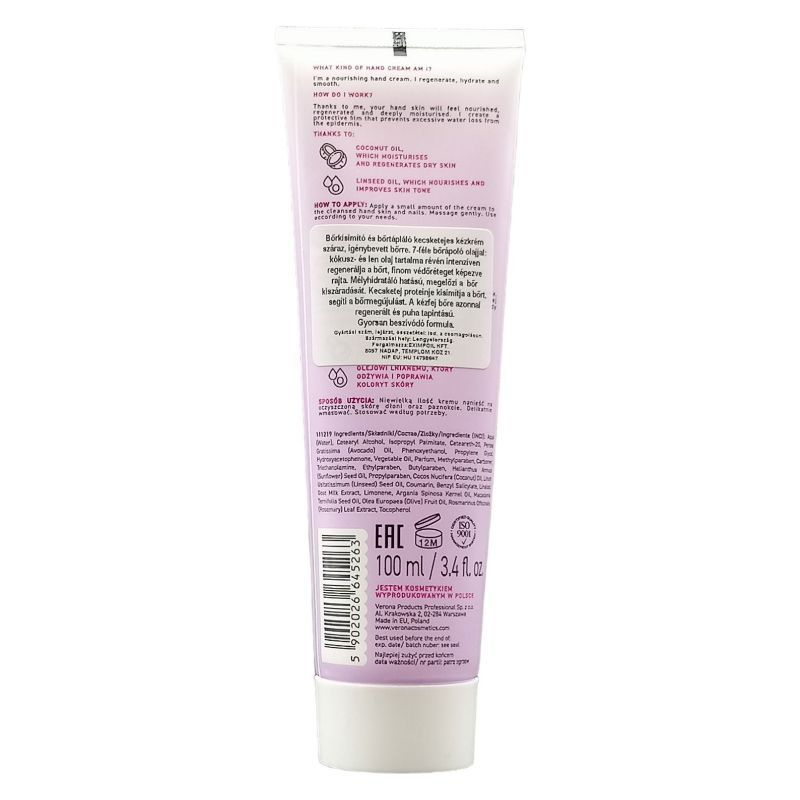7-féle bőrápoló olajjal: kókusz- és len olaj tartalma révén intenzíven regenerálja a bőrt, finom védőréteget képezve rajta. Mélyhidratáló hatású, megelőzi a bőr kiszáradását. Kecsketej proteinje kisimítja a bőrt, segíti a bőrmegújulást. A kézfej bőre azonnal regenerált és puha tapintású. Gyorsan beszívódó formula.