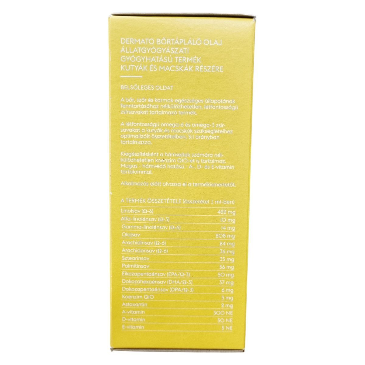 A Dermato bőrtápláló olaj egy állatgyógyászati gyógyhatású készítmény kutyák és macskák számára, amely létfontosságú omega-6 és omega-3 zsírsavakat optimális, 5:1 arányban tartalmaz, hogy támogassa a bőr, szőrzet és karmok egészségét. Kiegészíti ezt koenzim Q10-gyel, ami nélkülözhetetlen a hámsejtek számára, valamint magas A-, D- és E-vitamin tartalommal, amelyek együttesen hozzájárulnak a bőr védelméhez és regenerálódásához. Az adagolási útmutató és a felhasználási javaslatok részletesen ismertetik, hogyan alkalmazható a készítmény különböző testsúlyú kutyák és macskák esetében, továbbá külön figyelmet kap a vemhes állatok dózisa is. A termék csak állategészségügyi vagy ápolási célra készült, és gyermekektől elzárva kell tartani. Környezettudatos csomagolás jellemzi, a papír FSC® tanúsítvánnyal rendelkezik.