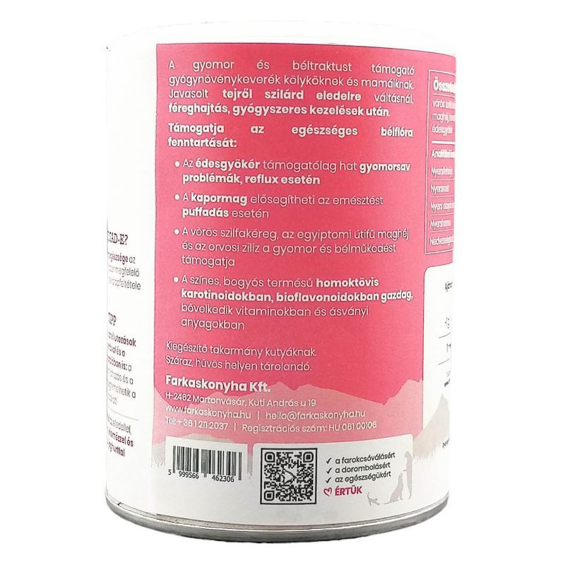 Érzékeny emésztésű kutyák számára kifejlesztett gyógynövénykeverék. Ajánlott étrendváltáskor, utazások alkalmával, gyógyszeres kezeléseket, féreghajtást követően, valamint stresszes élethelyzetekben és az érzékeny pocak támogatására a mindennapokban. Támogatja az egészséges bélflóra fenntartását: Az édesgyökér támogatólag hat gyomorsav problémák, reflux esetén. A kapormag elősegítheti az emésztést puffadás esetén. A vörös szilfakéreg, az egyiptomi útifű maghéj és az orvosi ziliz a gyomor és bélműködést támogatja. A színes, bogyós termésű homoktövis karotinoidokban, bioflavonoidokban gazdag, bővelkedik vitaminokban és ásványi anyagokban.Tudtad-e?