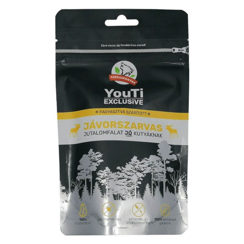 Fagyasztva szárított jávorszarvas jutalomfalat - jó kutyáknak. 150-200g hús felhasználásával készül. A jávorszarvas húsa mellett belsőséget is csempésztek bele.
