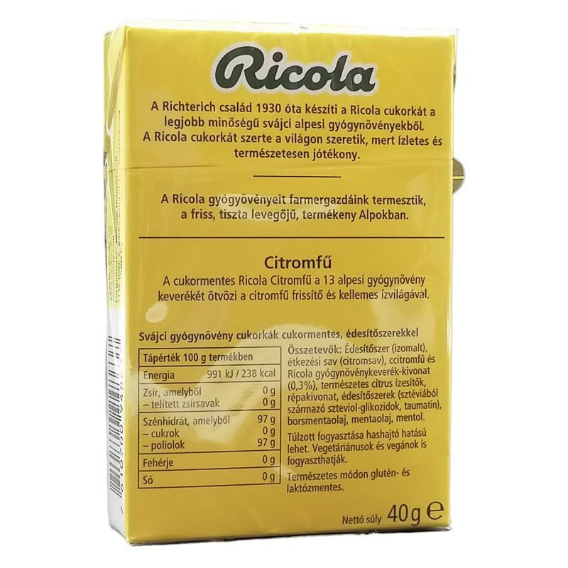 Összetevők: izomalt, étkezési sav (citromsav), citromfű és Ricola gyógynövény-keverék kivonat (0,3 %) a következő gyógynövényekből: lándzsás útifű, fehér mályva, borsmenta, kerti kakukkfű, orvosi zsálya, közönséges palástfű, cickafark, hasznos földitömjén, erdei mályva, bodzavirág, tavaszi kankalin, orvosi veronika, orvosi pemetefű; természetes citrus ízesítő, édesítőszerek (aszpartám, aceszulfám-K), természetes menta ízesítő, mentol, színezék (béta-karotin). Túlzott fogyasztása hashajtó hatású lehet. Fenilalanin-forrást tartalmaz.