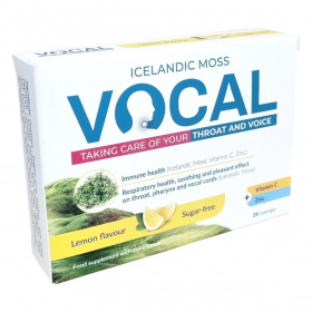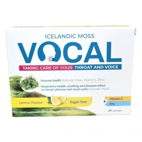 Az ICELANDIC MOSS VOCAL izlandi zuzmóval, C-vitaminnal és cinkkel készült étrend-kiegészítő, amely nyugtató és kellemes hatással lehet a torokra, garatra és a hangszálakra. Az izlandi zuzmó hozzájárulhat a torok és a garat irritációjának enyhítéséhez, valamint védi a száj és a torok nyálkahártyáját. A C-vitamin és a cink pedig támogathatják az immunrendszer megfelelő működését, és segíthetik a sejtek védelmét az oxidatív stressztől. A cink szerepe lehet a sejtosztódás folyamatában. A termék citrom ízű, cukormentes, 24 szopogató tablettát tartalmaz, amelyek édesítőszerekkel készülnek. A készítmény használata ajánlott 4 éves kortól, naponta négyszer egy tabletta lassú szopogatásával.