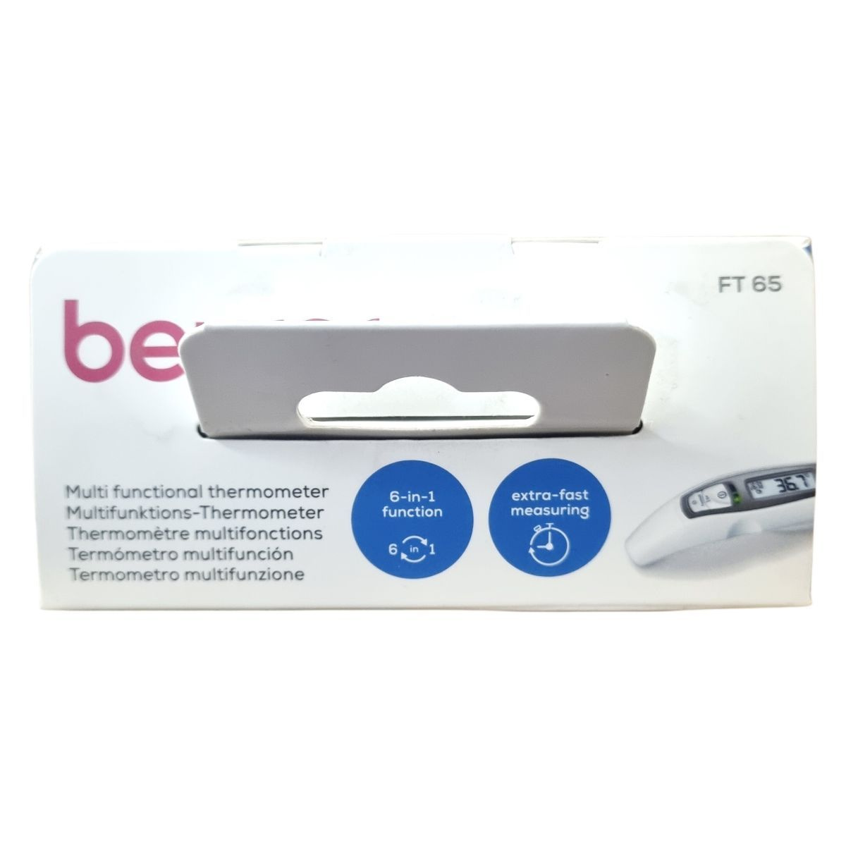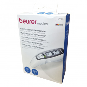 A Beurer FT 65 egy hat az egyben multifunkciós hőmérő, amely infravörös méréstechnológiát alkalmazva pillanatok alatt mér homlok-, fül- és felületi hőmérsékletet. A készülék lázriasztással rendelkezik, amely 38 °C-tól vörös LED fényjelzéssel figyelmeztet. A nagy kijelzőn megjelenik a mérési eredmény, a dátum és az idő, így a mérések könnyen nyomon követhetők a 10 memóriahelynek köszönhetően. A hőmérő higanymentes és üveg nélküli, ezért biztonságosan használható, fertőtleníthető, valamint az automatikus kikapcsolás segíti az elemkímélést. A működési hőmérséklet 15 °C és 35 °C között van, az elemek 2 db 1,5 V AAA típusú akkumulátor. A műszer orvosi eszköznek minősül, és német mérnöki pontossággal készült.