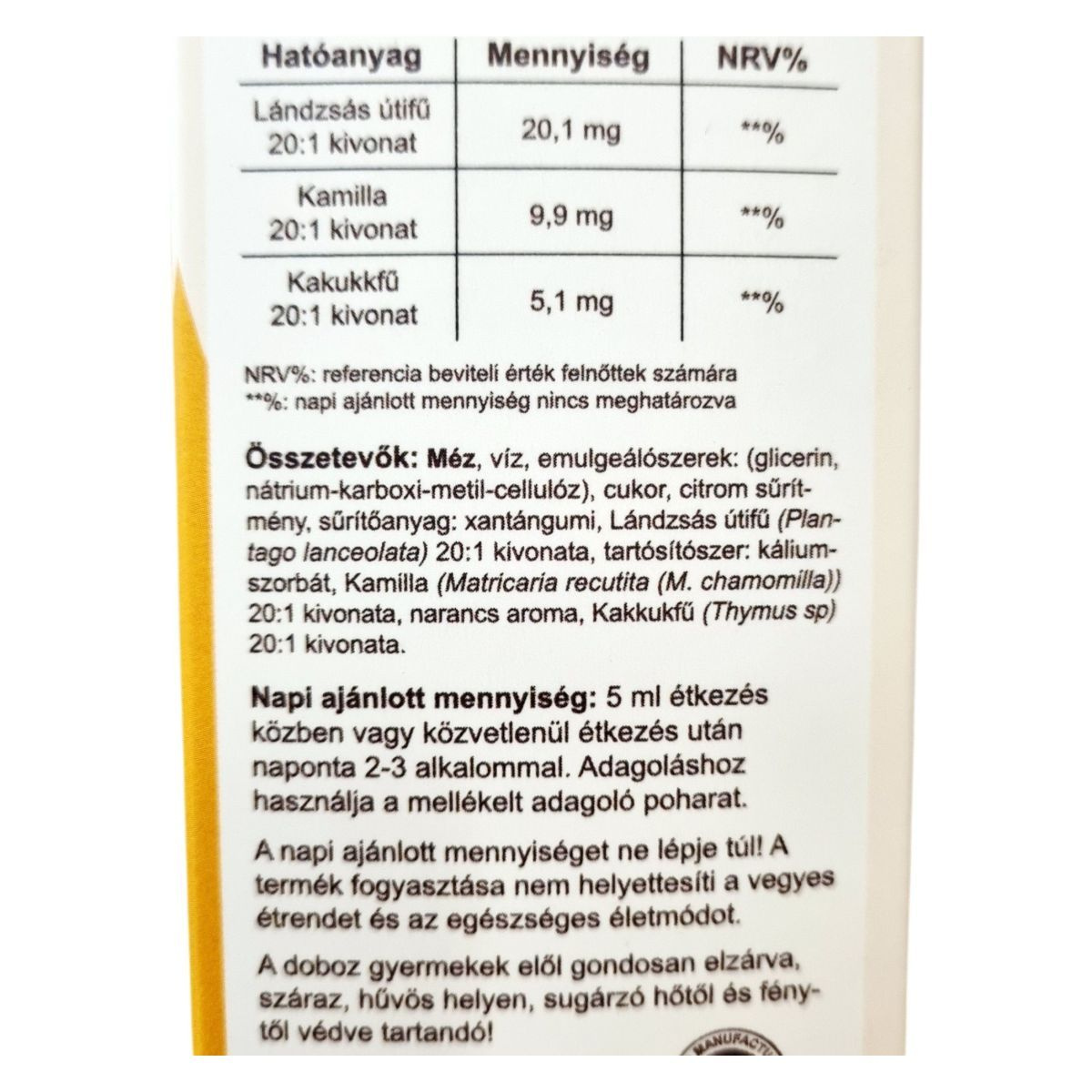 Méz, víz, emulgeálószerek: (glicerin, nátrium-karboxi-metil-cellulóz), cukor, citrom sűrítmény, sűrítőanyag: xantángumi, Lándzsás útifű (Plantago lanceolata) 20:1 kivonata, tartósítószer: kálium-szorbát, Kamilla (Matricaria recutita (M. chamomilla)) 20:1 kivonata, narancs aroma, Kakukkfű (Thymus sp) 20:1 kivonata.