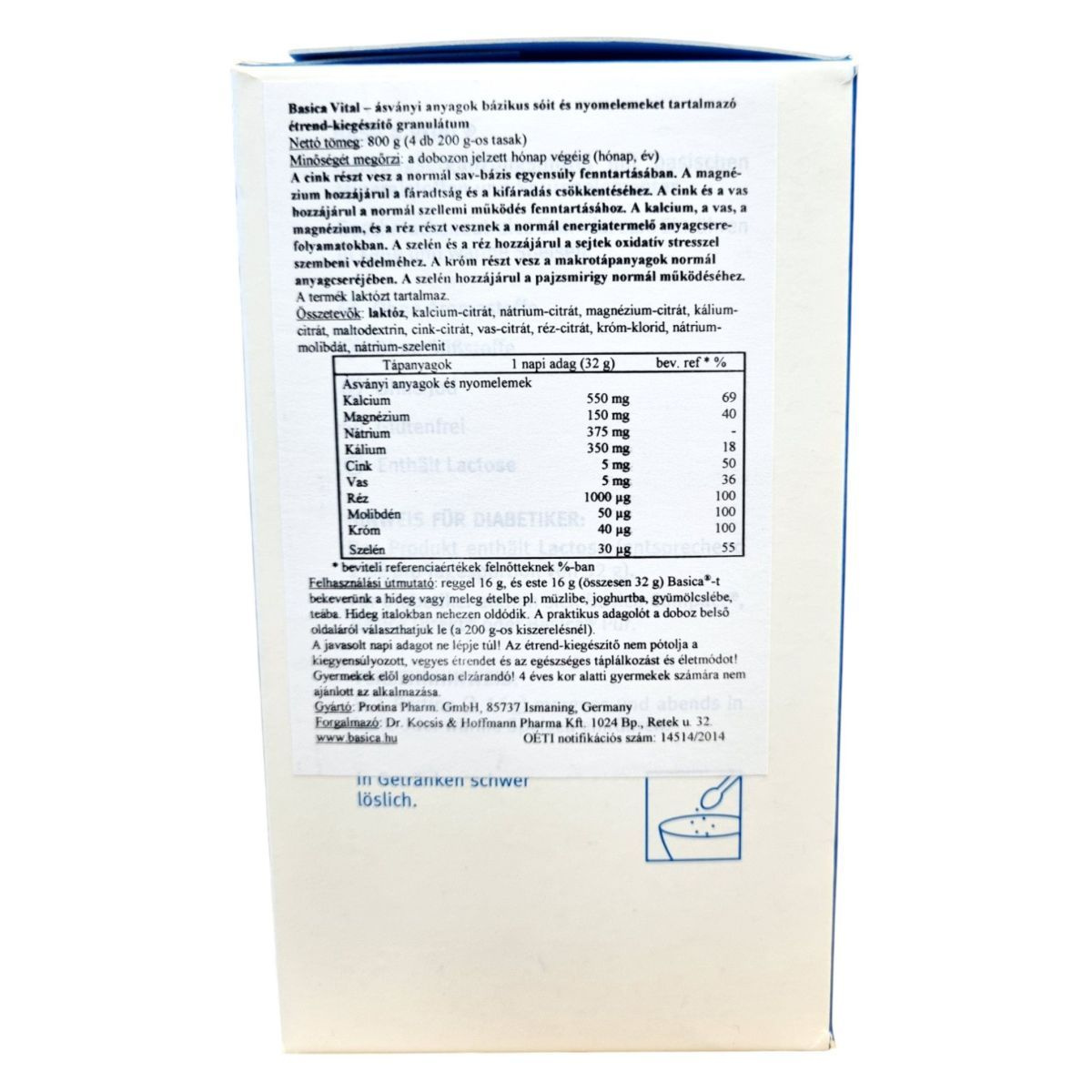 A Basica Vital étrend-kiegészítő granulátum bázikus ásványi anyagokat és nyomelemeket tartalmaz, amelyek hozzájárulhatnak a normál sav-bázis egyensúly fenntartásához. A termék cinket, magnéziumot és szelént tartalmaz, amelyek támogathatják az immunrendszer normál működését. A granulátum íztelen, és hideg vagy meleg ételekbe keverhető. A termék laktózt tartalmaz, és nem ajánlott 4 éves kor alatti gyermekek számára. A Basica Vital granulátumot a Protina Pharm. GmbH gyártja Németországban, és a Dr. Kocsis & Hoffmann Pharma Kft. forgalmazza Magyarországon.