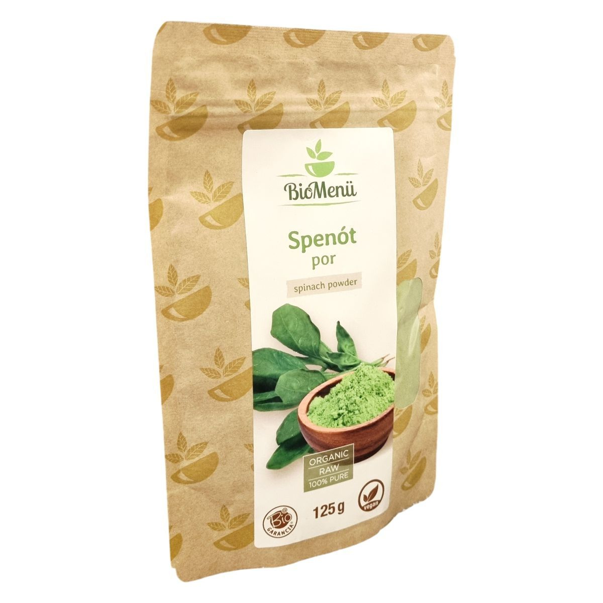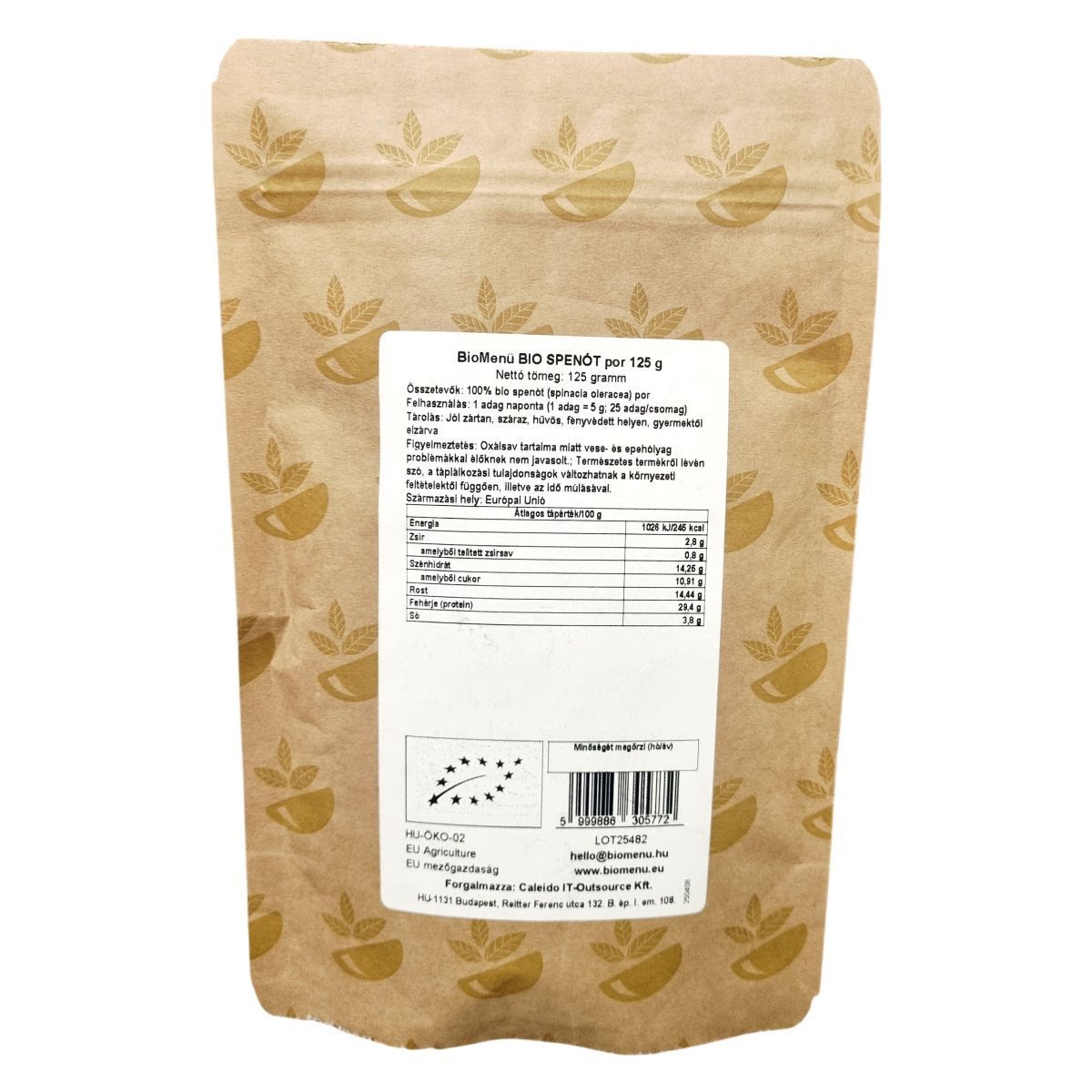 A BioMenü BIO SPENÓT por egy 100% tiszta, organikus és vegán termék, amelyet az Európai Unióban állítanak elő. A termék 125 grammos kiszerelésben kapható, és 25 adagot tartalmaz. A spenótpor gazdag fehérjében és rostban, ami hozzájárulhat az egészséges táplálkozáshoz. Az oxálsav tartalom miatt azonban nem ajánlott vese- és epehólyag problémákkal küzdőknek. A termék minőségét a HU-ÖKO-02 tanúsítvány garantálja.