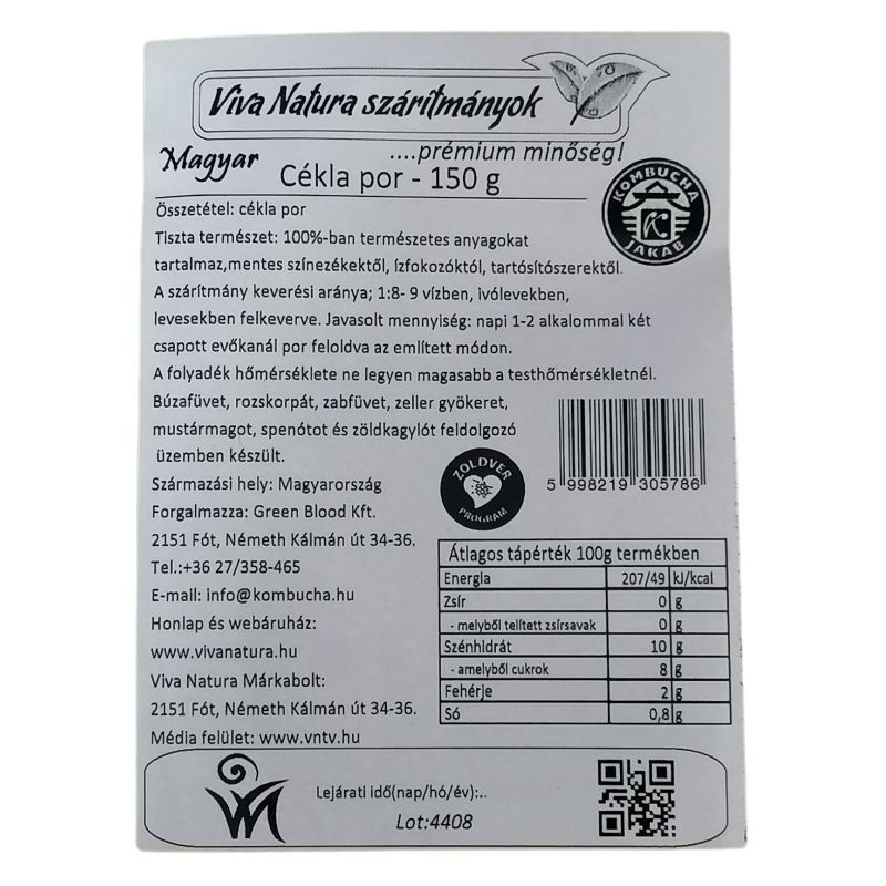 Viva natura cékla por alutasak 150 g. Tiszta természet 100%-ban természetes anyagokat tartalmaz, mentes minden színezéktől, ízfokozótól, tartósítószertől.