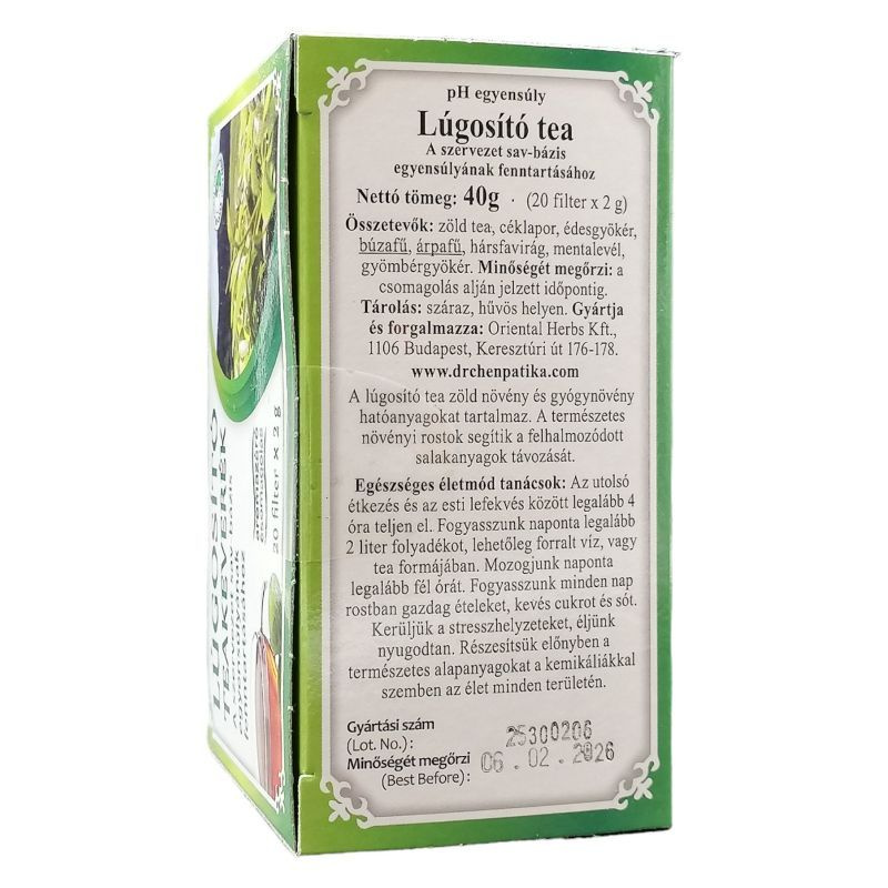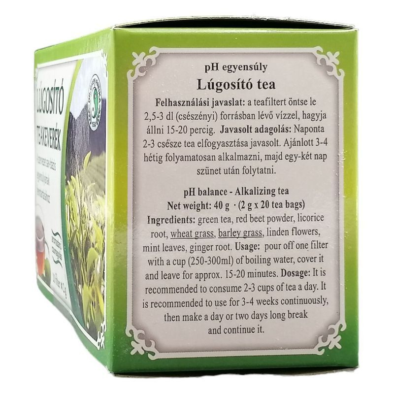 A természetes növényi rostok segítik a felhalmozódott salakanyagok távozását. Támogassuk szervezetünket minél több lúgosító étellel, hogy energikusabbak és ellenállóbbak lehessünk. A teakeverék nyolc természetes növényi alapanyag áldásos hatásait ötvözi. Az emberi szervezet sav-bázis egyensúlyának elmélete egy világhírű japán orvostól származik, aki meghatározta a savas és lúgos állapot értékét, miszerint 7.35-7.45 pH érték között lúgos, 7.35 pH alatt savas közegről beszélünk. A lúgos szervezet egészséges és ellenálló a betegségekkel szemben. Ha ez az érték hosszabb ideig a savas irányba tolódik, fokozatosan elindul egy kedvezőtlen folyamat a szervezetben, mely még nem beteg, de már nem is teljesen egészséges. Ha a pH érték 7.0 alá csökken, akár betegségek is kialakulhatnak. Naponta 2-3 csésze tea elfogyasztása javasolt. Ajánlott 3-4 hétig folyamatosan alkalmazni, majd egy-két nap szünet után folytatni.
