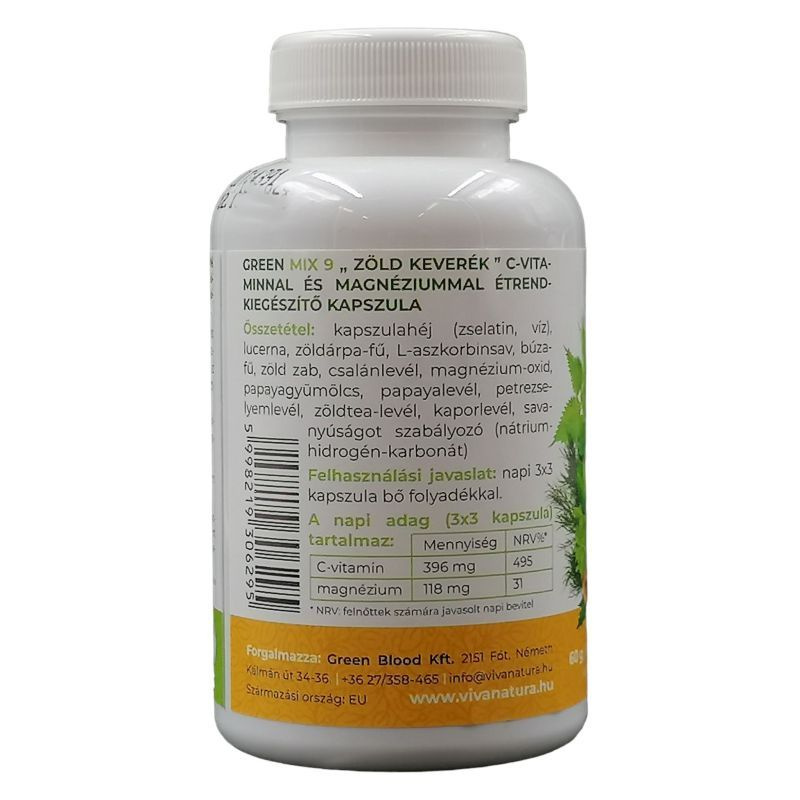A kíméletes, alacsony hőfokú feldolgozás-technikának köszönhetően a termék megőrizte természetes vitamin és ásványi anyag tartalmát. A Green Mix 9 kapszulában a borsmentát kaporral váltottuk fel, így a terméket homeopátiás kezelésben részesülők is fogyaszthatják. Összetétel: Zselatin kapszula, lucerna, zöldárpa fű, búzafű, C-vitamin, zöldzab,csalánlevél, papaya (gyümölcs és levél), magnézim-oxid, petrezselyem, zöldtea, kapor, savanyúságot szabályozó (nátrium-hidrogén-karbonát). A napi adag: 3x3 kapszula.