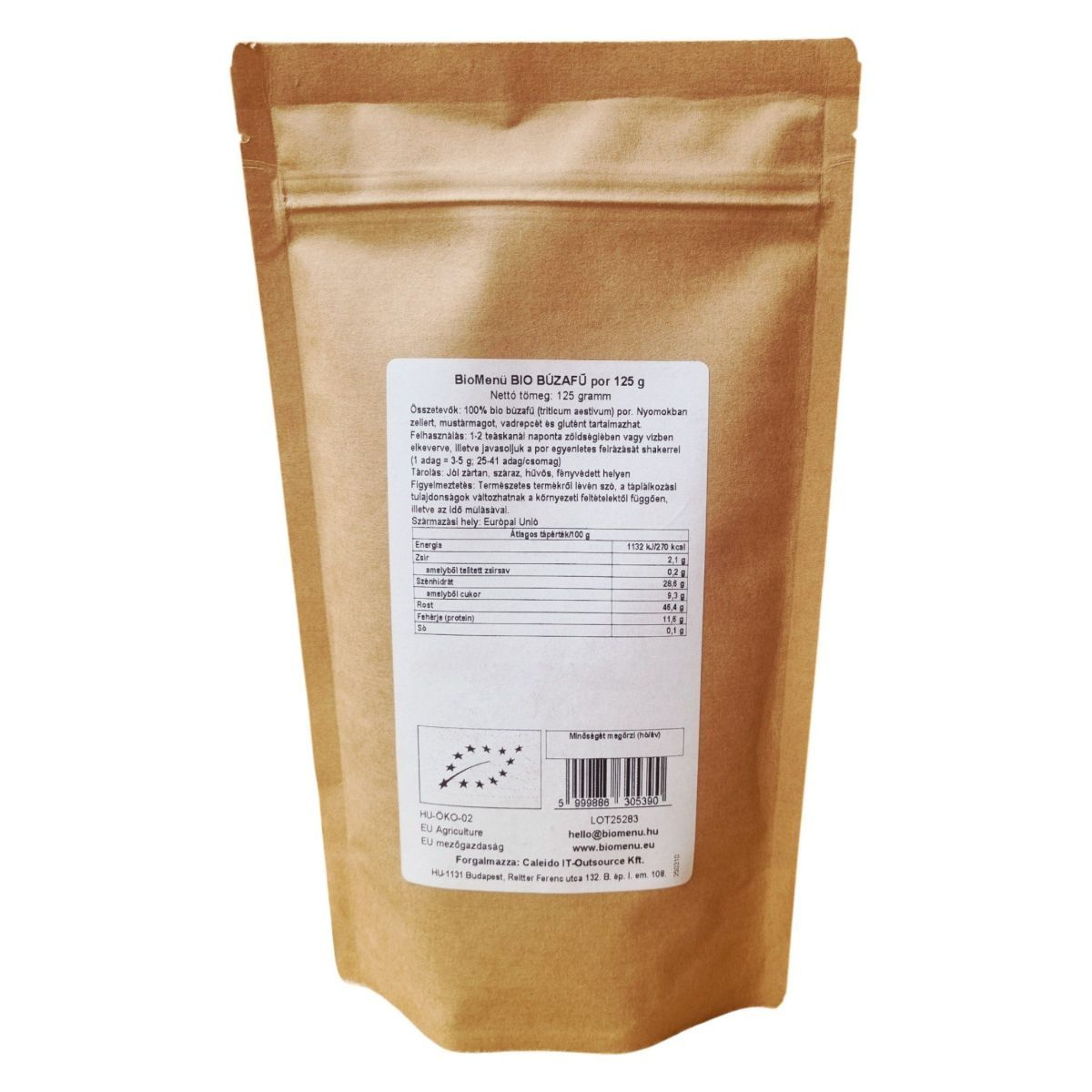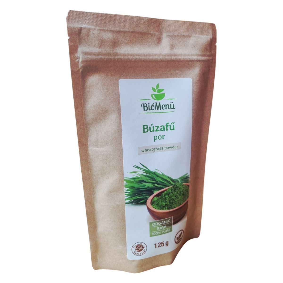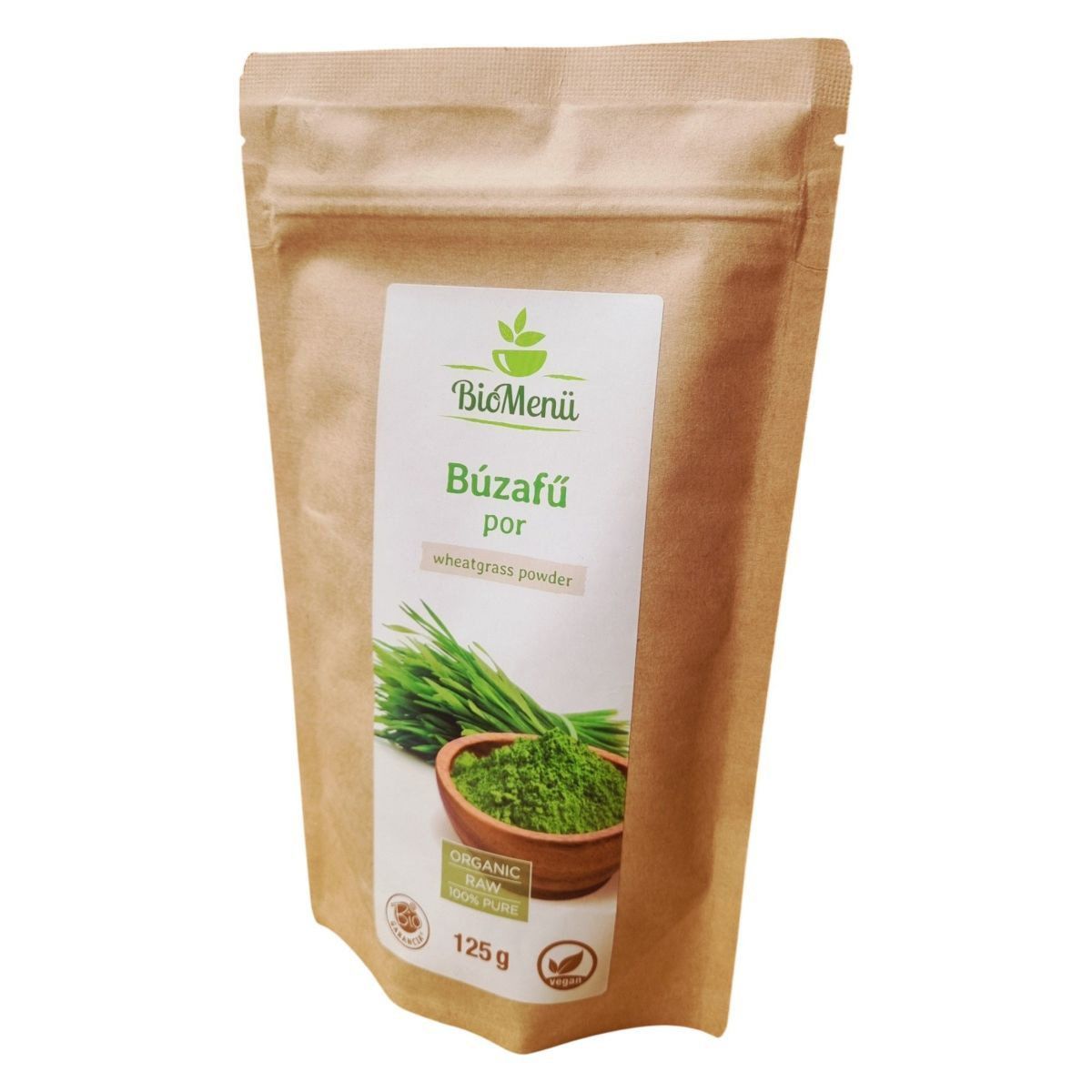 A BioMenü BIO Búzafű por egy 100% tiszta, organikus termék, amelyet az Európai Unióban állítanak elő. A termék nettó tömege 125 gramm, és a csomagolás 25-41 adagot tartalmaz. A búzafű por gazdag rostokban és fehérjében, és nyomokban zellert, mustármagot, vadrepceét és glutént tartalmaz. A termék megfelel a bio, raw és vegán étrendi irányzatoknak. A tárolás során ügyelni kell arra, hogy a terméket jól zártan, száraz, hűvös és fényvédett helyen tartsuk. A termék forgalmazója a Caleido IT-Outsource Kft., és rendelkezik HU-ÖKO-02 tanúsítvánnyal.