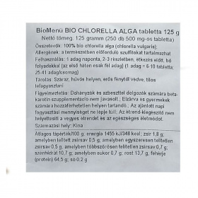 Pozitívan hat a sejtregenerálódásra, valamint a sebek gyógyulási folyamataira, erősíti továbbá a stresszel szembeni ellenálló-képességet és tompítja a testszagokat. A chlorella elsősorban a gyomor, a lép, a vastagbél, a máj, az epehólyag, a szívburok, valamint a három sugárzó energetikai pályáit harmonizálja. A chlorella: tisztítja az emésztőrendszert, elsősorban a vastagbelet, támogatja a hasznos bélmikroflóra kialakulását, javítja a bélműködést. Támogatja a szervezet természetes ellenálló-képességét. Megtisztítja a testet a mérgektől, a nehézfémektől és a kemikáliáktól. Pozitívan befolyásolja a vérképzést, és támogatja a fehérvérsejtek tevékenységét. Rendkívüli hatással van a szövetek regenerálódására. Csökkenti a máj, de a vér koleszterinszintjét is. Tisztítja a vért, éppen ezért kiválóan védi a májat és a vesét. Semlegesíti a szabad gyököket, lelassítja a szervezet öregedésének folyamatát. Fiatalító hatással bír, magas RNA (10%) és DNA (3%) tartalmának köszönhetően. Elősegíti a szervezet teljes regenerálódását. Javítja a bőr minőségét és egészségi állapotát. Minden fontos vitamin, ásványi anyag és aminosav (beleértve az esszenciális, azaz nélkülözhetetlen aminosavakat is) megtalálható benne. Nagy mennyiségben 10-23%-ban tartalmaz CGF-t (Chlorella növekedési tényező), ami a szakértők szerint a Chlorella leghatékonyabb összetevője is egyben. Chlorella használata: az értékes nutritív anyagoknak köszönhetően a Chlorella kiváló, mindennap szedhető táplálék-kiegészítő készítmény. Használata minden redukciós diéta, esetleg vegetáriánus életmód esetében ideális. A gyerekeknél pozitívan hat a megfelelő táplálkozási szokások kialakításakor. Hathatós segítséget nyújthat akné, kiütések, gyulladások, ekcéma, de nehezen gyógyuló felületi sebek vagy sérülések (leforrázás, égés, marás, stb.) gyógyításakor is. Támogatja a hosszantartó stressznek vagy terhelésnek kitett szervezet regenerálódását és lábadozását. Kiválóan alkalmazható a műtéti beavatkozás, illetve bármilyen sugárkezelés után. Javasolt felhasználás, adagolás Egy adag = 6 tabletta. Javasoljuk, hogy naponta 3x2 500mg-os tablettát vegyen be, bő vízzel. A legjobb, ha étkezés előtt fél órával teszi mindezt. Az első hetet csökkentett adaggal kezdje (3-4 tablettát), hogy a méregtelenítési tüneteket minimalizálja. Tárolás: jól zártan, száraz, hűvös helyen, gyermekek számára hozzáférhetetlen módon. Rendelet: ha Ön terhes, szoptat, beteg, vagy gyógyszereket szed, konzultáljon kezelőorvosával, mielőtt bármiféle étrend-kiegészítőt használna! Ha az orvosa nem nyitott az az étrend-kiegészítők alkalmazására, keressen fel egy természetgyógyász szakembert! Az ajánlott napi fogyasztási mennyiséget ne lépje túl! Az étrend-kiegészítő nem helyettesíti a vegyes étrendet és az egészséges életmódot.