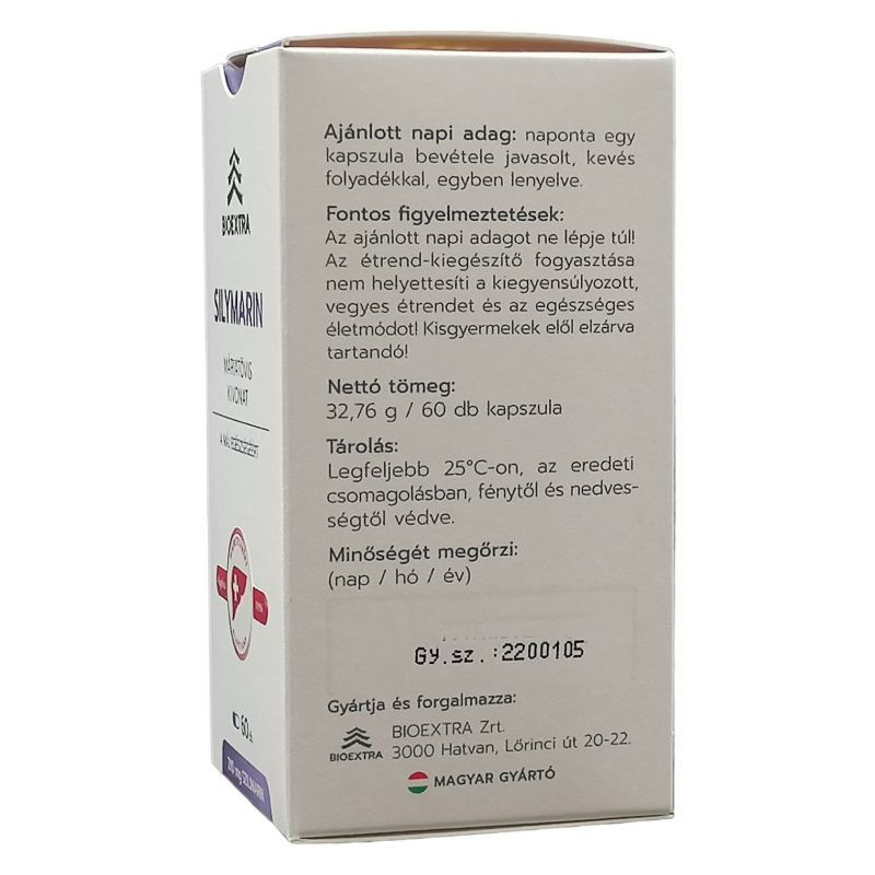 Hatóanyaga, a szilimarin védi a májat a toxikus anyagokkal szemben, lassítja a májkárosodást és gyorsítja a szövetek regenerációját. Alkalmazható gyógyszeres terápia kiegészítésére, támogatja a méregtelenítő kúra eredményességét. A Bioextra Silymarin kapszula a Májbetegekért Alapítvány ajánlásával rendelkezik és a lehető legmagasabb szilimarin tartalmú étrend-kiegészítő készítmény. Összetevők: máriatövis kivonat, maltodextrin, zselatin, térfogatnövelő (kukoricakeményítő), poliszorbát 80, csomósodás gátló (megnézium-sztearát), színezék (vörös vas-oxid, titán-dioxid). Hatóanyag a napi adagban: 280 mg máriatövis kivonat, ebből 210 mg szilimarin/ 1 kapszula. Notifikációs szám: 7781/2010.