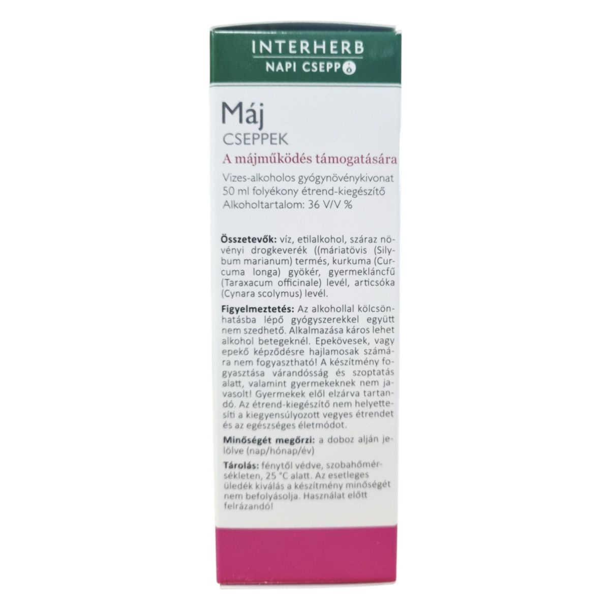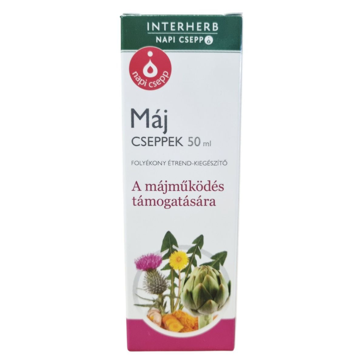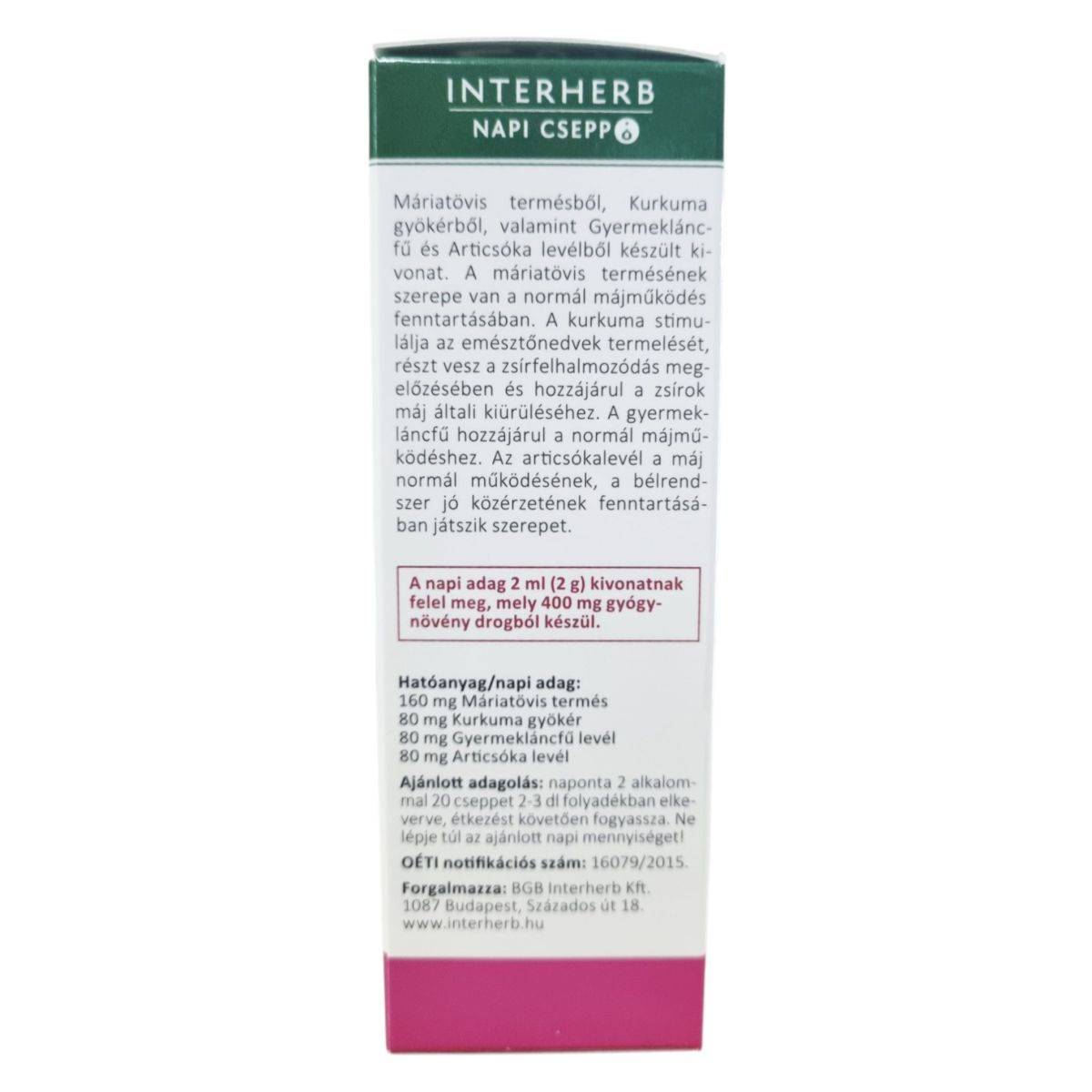 Az INTERHERB NAPI CSEPP Máj CSEPPEK egy vizes-alkoholos gyógynövénykivonat, amely a májműködés támogatására készült. A termék máriatövis, kurkuma, gyermekláncfű és articsóka kivonatot tartalmaz, amelyek hozzájárulhatnak a normál májműködés fenntartásához és az emésztés támogatásához. Az alkoholtartalom 36 V/V %, ezért alkohollal kölcsönhatásba lépő gyógyszerekkel nem szedhető, és nem ajánlott alkoholbetegek számára. A termék fogyasztása várandósság és szoptatás alatt, valamint gyermekeknek nem javasolt. A készítmény nem helyettesíti a kiegyensúlyozott vegyes étrendet és az egészséges életmódot.