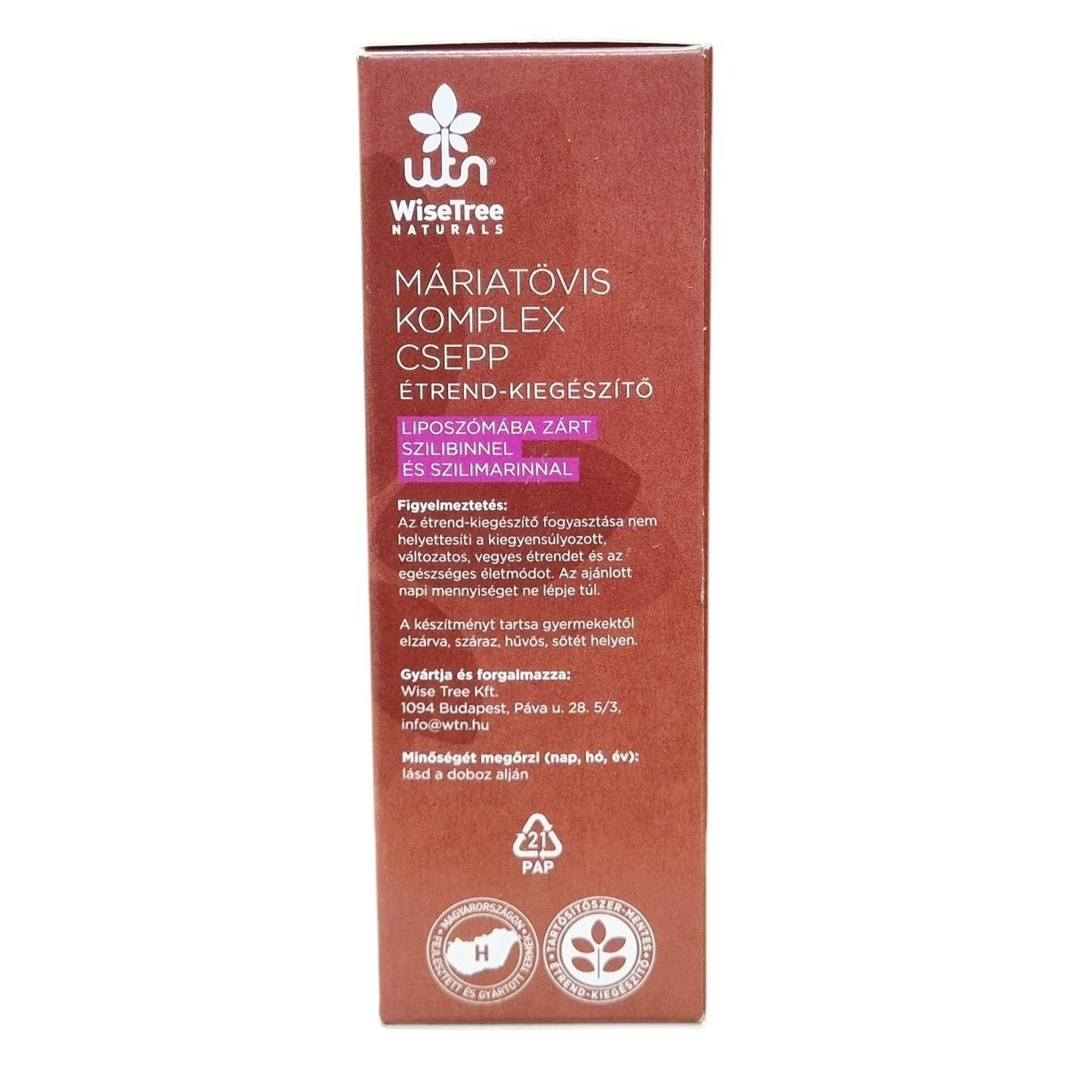 A máriatövis komplex csepp liposzómába zárt szilibint és szilimarinokat tartalmaz, melyek természetes módon fordulnak elő a máriatövismag kivonatban. A folyékony étrend-kiegészítő formulája 50 ml-es kiszerelésű, amely mintegy 60 adag elfogyasztására elegendő. A termék szintén tartalmaz organikus glicerin, lecitin, etil-alkohol és más kísérő összetevőket, amelyek a hatóanyagok stabil és biohasznosuló formában való előállítását segítik. A készítmény fejlesztése és gyártása Magyarországon történik, lipid- és növényi mátrix-technológiával támogatva, mely a hatóanyagok hatékony felszívódását célozza. A termék nem tartalmaz tartósítószert, így természetes és tiszta választás lehet az étrend kiegészítéséhez.