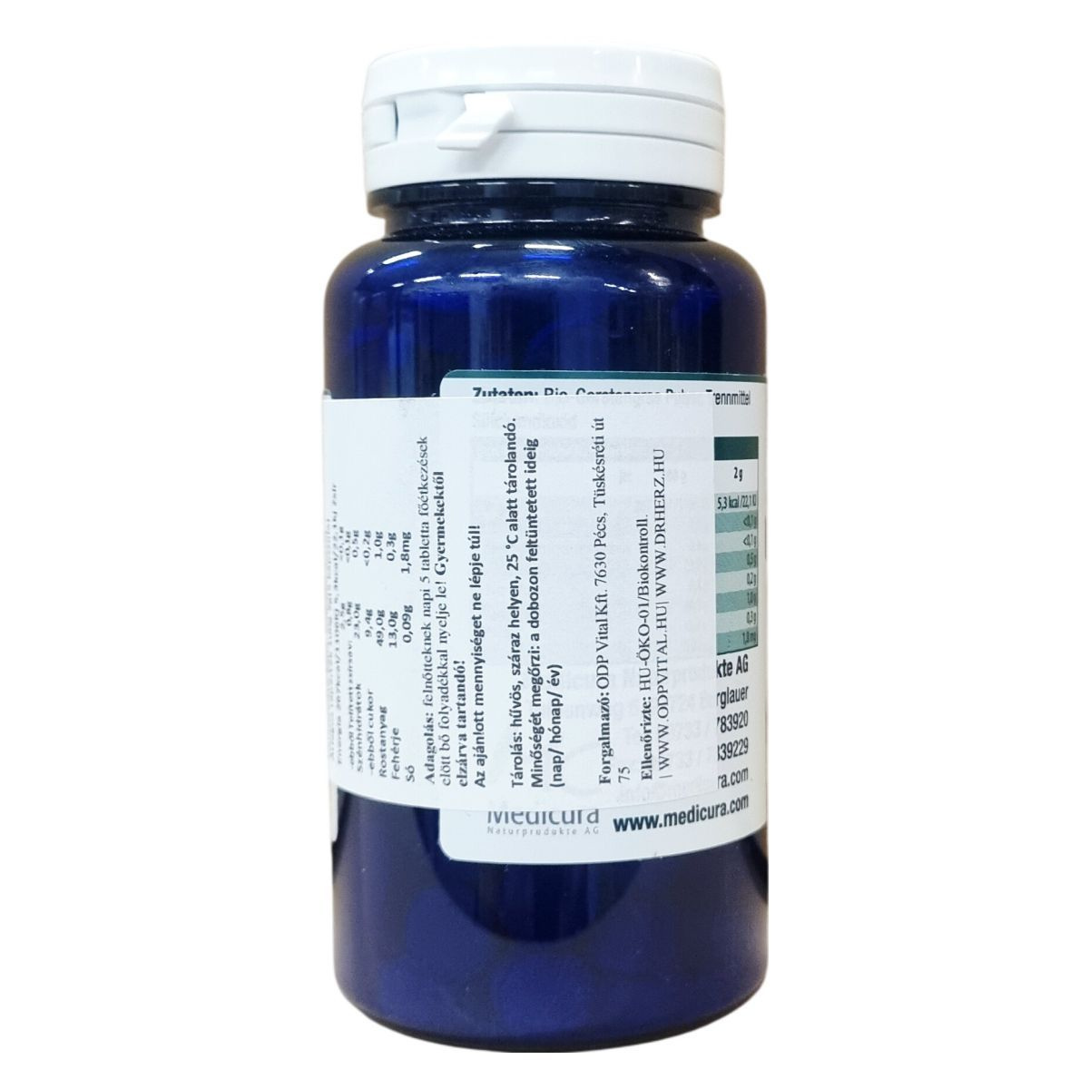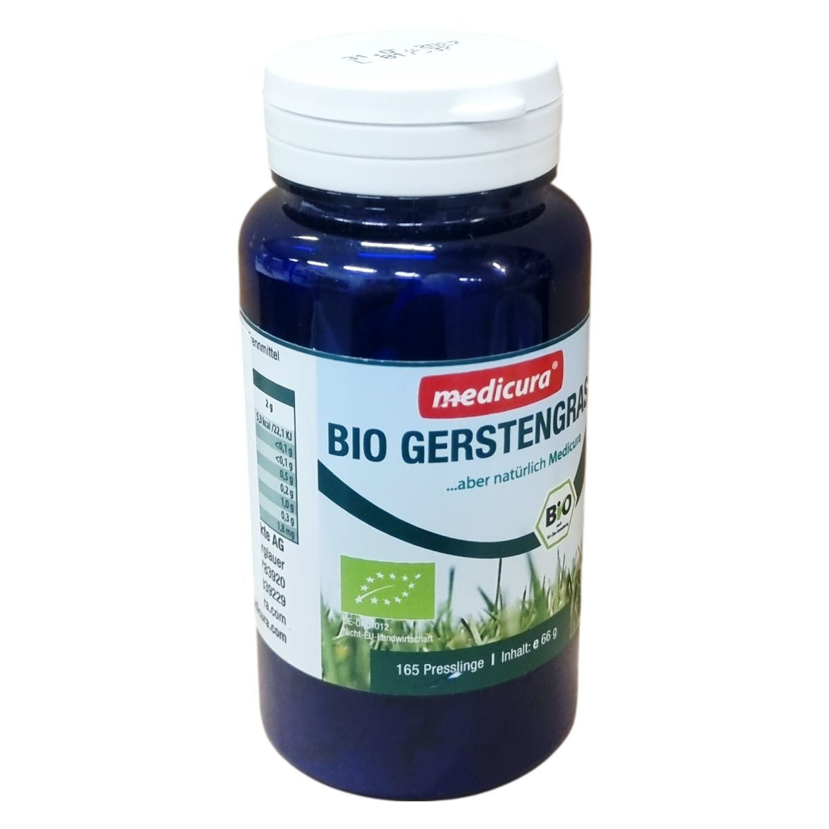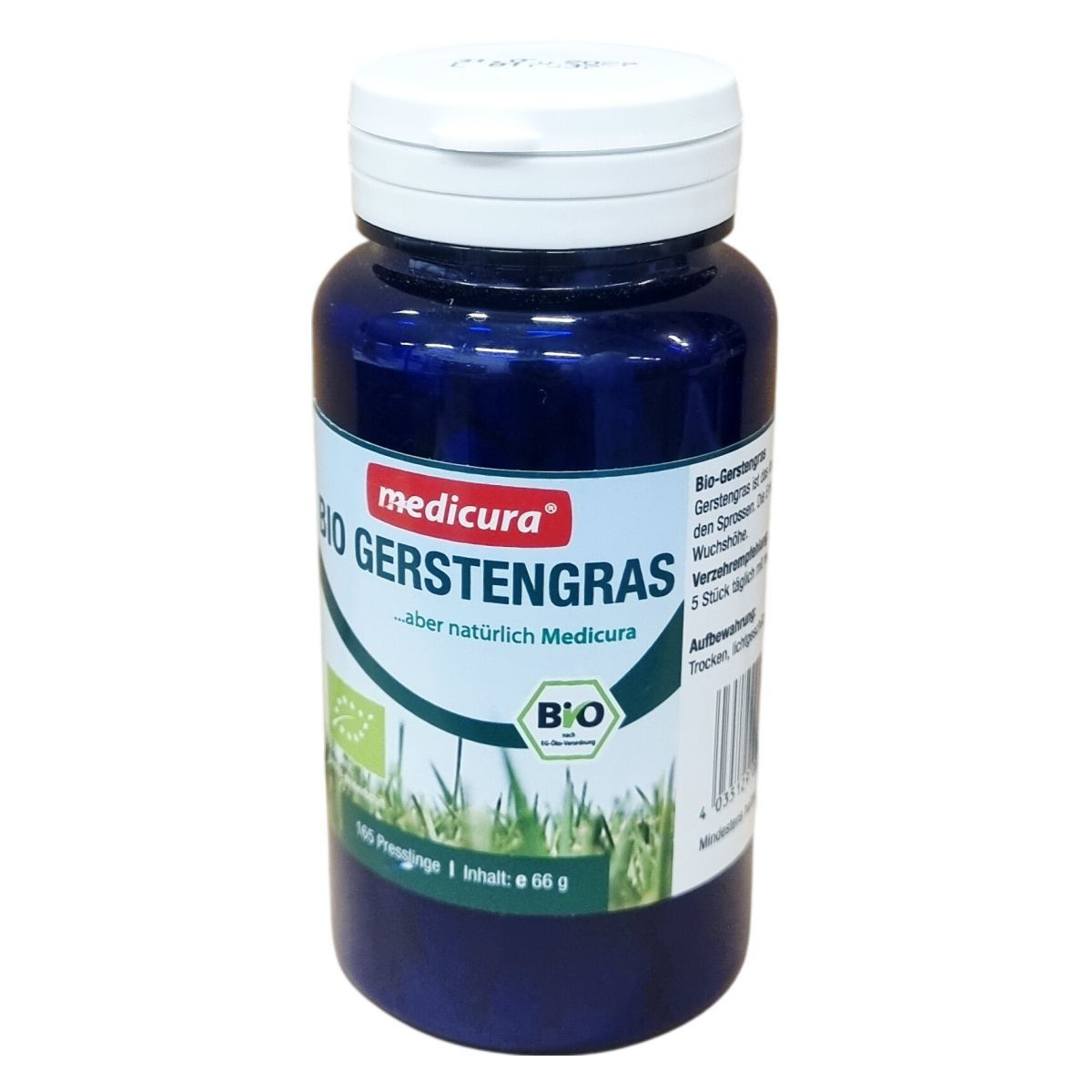 A medicura® Bio Gerstengras terméke bio minőségű zöldárpa port tartalmaz tablettás formában. Az árpafű a fejlett hajtások közé tartozik, amelyeket a növekedés csúcsmagasságánál takarítanak be. A termék 165 tablettát tartalmaz, összsúlya 66 gramm. Az adagolási javaslat napi 5 tabletta bő folyadékkal, amelyet főétkezések előtt ajánlott elfogyasztani. A termék csomósodás gátló anyaga szilícium-dioxid. A csomagoláson feltüntetett minőségmegőrzési idő alapján tárolása hűvös, száraz helyen, 25 °C alatt kell történjen. A terméket a magyar ODP Vital Kft. forgalmazza, a medicura Naturprodukte AG gyártja. Az ellenőrzést a HU-ÖKO-01 Biokontroll végezte el. Az energia- és tápérték adatok részletesen tartalmazzák a kalória- és makrotápanyag értékeket 100 g és 5 tabletta mennyiségre vonatkozóan egyaránt.