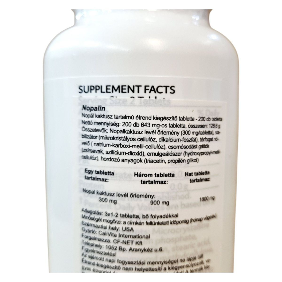 A Nopalin étrend-kiegészítő tabletta a CaliVita International terméke, amely nopal kaktusz levél őrleményt tartalmazhat. A termék 200 db, egyenként 643 mg-os tablettát tartalmaz, összesen 128,6 g nettó mennyiségben. A gyártás az USA-ban történik, a legszigorúbb minőségi előírásoknak megfelelően. A termék célja, hogy támogassa az egészséges életmódot, de nem helyettesíti a vegyes étrendet. A forgalmazó a CF-NET Kft, telephelye Budapesten található.