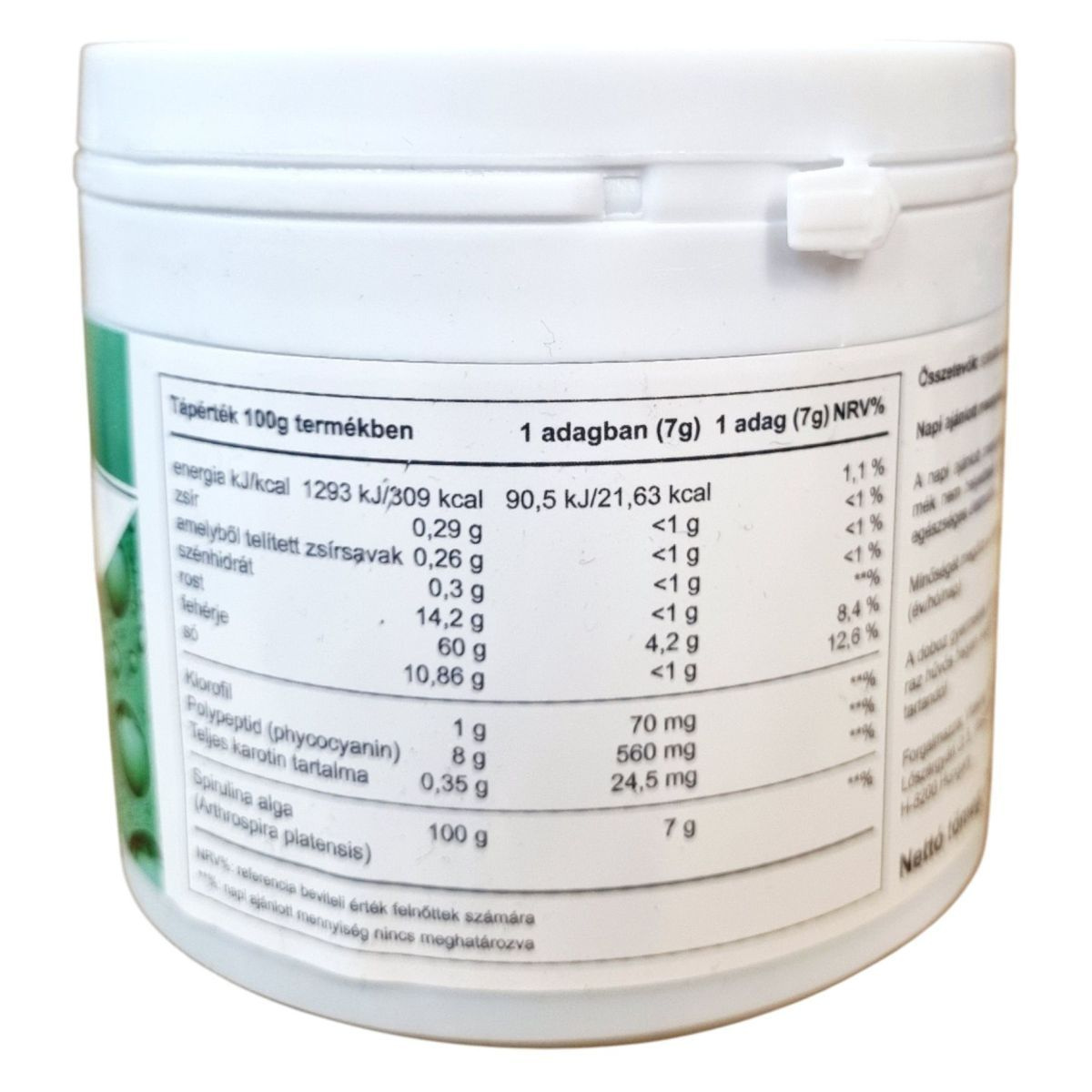 A spirulina alga por egy természetes energiaforrás, amely tele van tápanyagokkal és vitaminokkal. Segít fenntartani a vitalitást és az egészséges életmódot támogató étrend része lehet. A spirulina alga por rendszeres fogyasztása hozzájárul a fáradtság csökkentéséhez és az energiaszint növeléséhez.