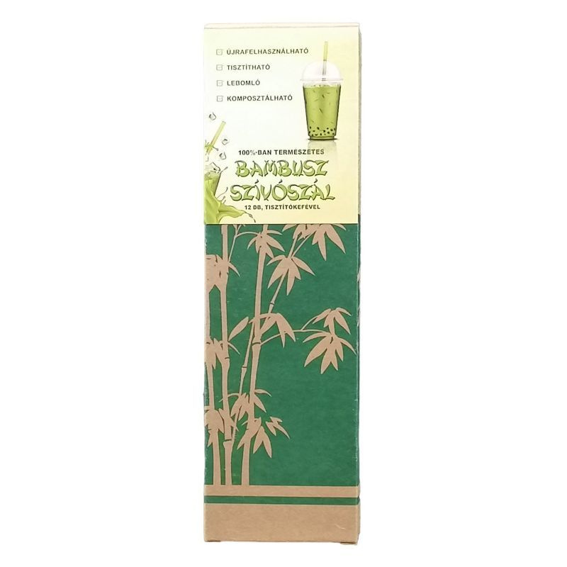 Kiszerelés: 12 db bambusz szívószál + tisztítókefe / csomag