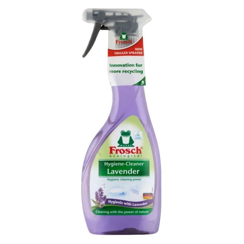 A levendula illatosítású Frosch higiéniás tisztító eltávolítja a baktériumoknak táptalajt biztosító szennyeződéseket, illetve vízkő és szappanlerakódásokat.