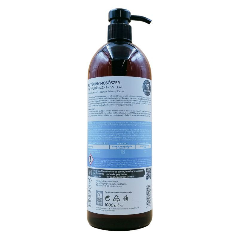 Folyékony mosószer fehér ruhákhoz friss illattal. Kimagasló mosóhatás növényi összetevőkkel, szövetkárosodás nélkül, 1000 ml-es kiszerelés: 33 mosásra elegendő. Prémium csomagolás, pumpás adagolóval. A fehér pamutból készült darabokhoz (ingek, terítők, törölközők, ágyneműk) kifejlesztett, friss illatú Herbow folyékony mosószer az alapos tisztító hatás mellett kíméletes a textíliához és a bőrhöz. Nem tartalmaz optikai fehérítőt. Az erősebben szennyezett és strapabíróbb ágyneműt, törölközőt vagy konyharuhát 60 °C fokon moshatjuk.