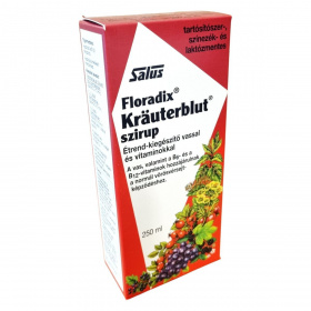 A Salus Floradix Kräuterblut szirup válogatott növényi és gyümölcs-kivonatokon alapuló, vasat és többféle B-vitamint, valamint C-vitamint tartalmazó étrend-kiegészítő, amely segíthet a fáradtság és kimerültség csökkentésében, és hozzájárulhat a normál vérképzéshez. Kellemes gyümölcsös ízének és könnyen fogyasztható szirup formájának köszönhetően ideális nők, várandós és szoptató anyák, serdülők és idősebbek számára egyaránt. A termék tartósítószer-, színezék-, alkohol- és laktózmentes, vegetáriánus étrendbe is beilleszthető.