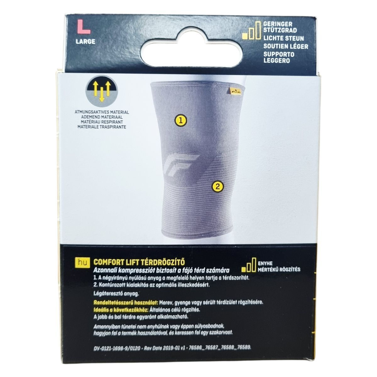 A FUTURO™ Comfort Lift térdrögzítő négyirányú nyúlású, lélegző anyagból készült, amely optimálisan tartja a térdet és biztosítja a kényelmes illeszkedést. A kontúrozott kialakítás segíti a megfelelő pozíció megtartását, miközben biztosítja a légáteresztést. Kismértékű támogatást nyújt, így túlzott merevség nélkül segít a fájó térd azonnali kompresszióban és támogatásban. A termék kézmosási javaslatokat tartalmaz: kézzel 30°C-on mosható, nem fehéríthető, nem szárítógépezhető, nem vasalható és nem vegytisztítható. A méretek S-től XL-ig terjednek, és mindkét térdre alkalmasak, a jobb és bal térden egyaránt használhatóak. A termék gyártása Kínában történik 3M részére, a 3M és FUTURO védjegyek a 3M tulajdonát képezik.
