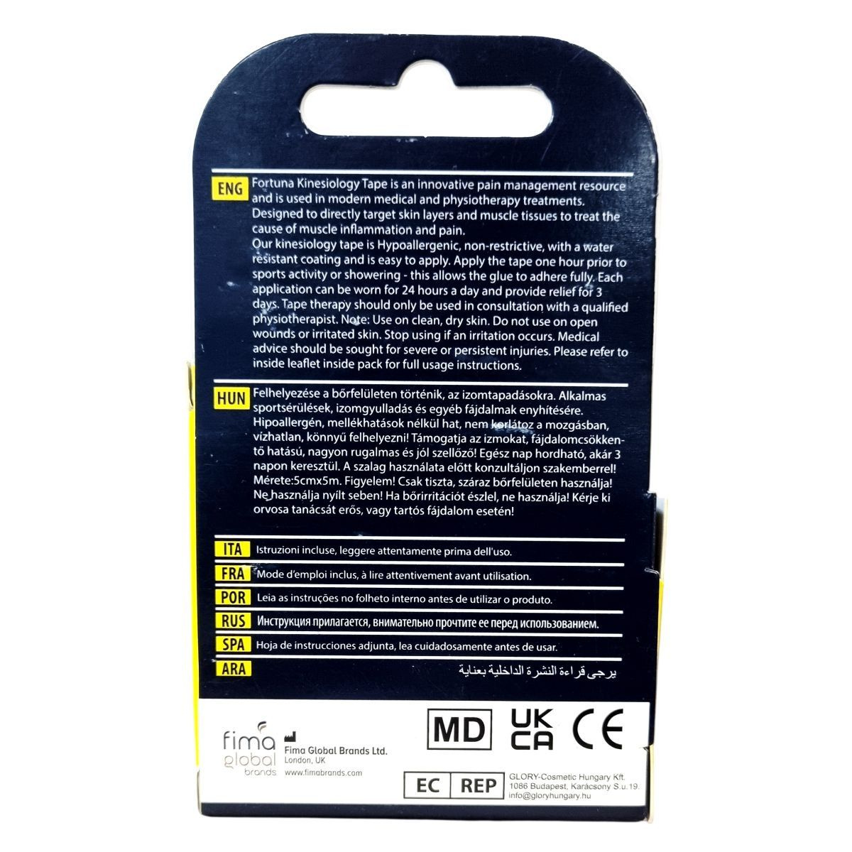 A kék színű Fortuna kinesiology tape egy innovatív fájdalomcsillapító segédeszköz, melyet modern orvosi és gyógytornászati kezelésekben használnak. Kifejezetten a bőrrétegek és az izomszövetek célzott kezelésére tervezték a gyulladás és fájdalom okának enyhítésére. A tape hipoallergén, nem korlátozza a mozgást, vízhatlan bevonattal rendelkezik, és könnyen felhelyezhető. Ajánlott a ragasztó teljes tapadásának érdekében sporttevékenység vagy zuhanyzás előtt egy órával alkalmazni. Az egyes felhelyezések 24 órán keresztül hordhatók, és akár 3 napig tartó fájdalomcsillapítást biztosítanak. A tapasszal végzett terápia kizárólag képzett gyógytornász tanácsával végezhető. A csomagban részletes használati utasítás található.