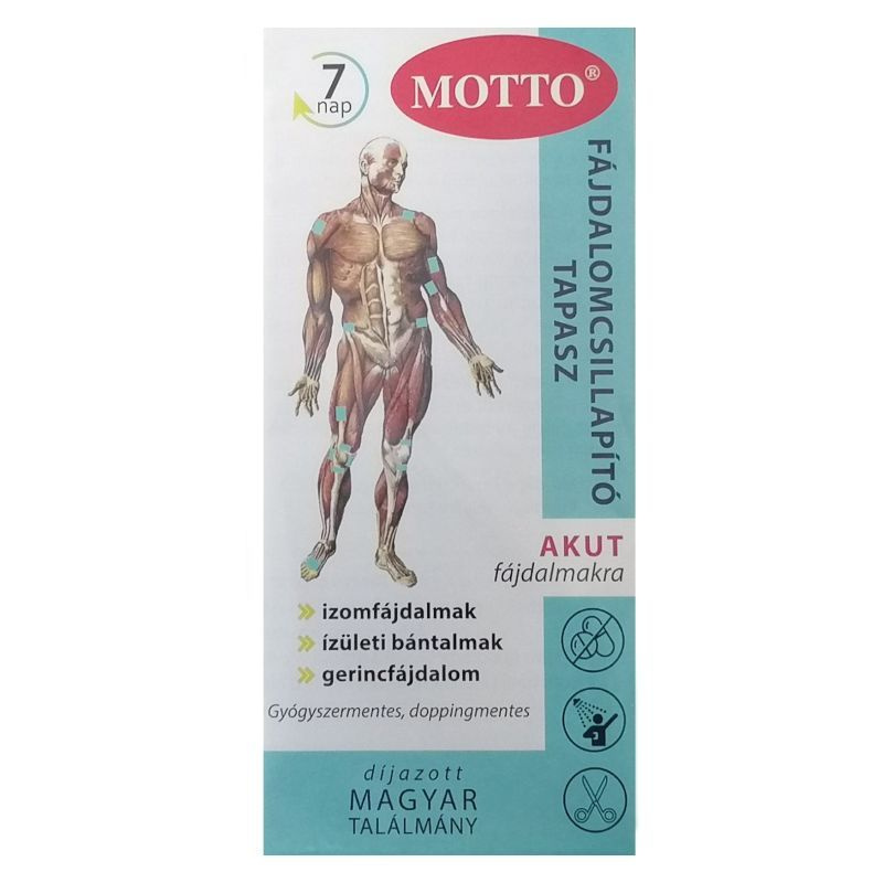 A Motto tapasznak gyulladáscsökkentő hatása is van! Az egy csomagban található 2x 15x5 cm-es tapaszból 6 db 5x5, vagy 10 db 3x5 cm-es darab vágható fel, így folyamatos használat esetén 1-2 hónapra elegendő. A fájdalmak órákon vagy napokon belül enyhülnek, illetve megszűnnek. A Motto tapaszból a fájdalom helyére, tiszta, száraz bőrre 3-5 cm-es csíkot ragasszunk fel.