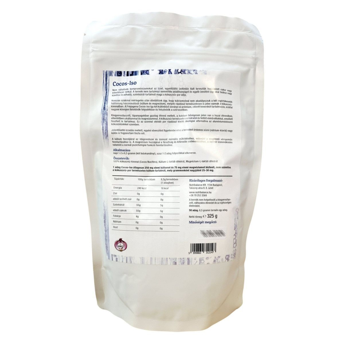 A Freyagena Cocos-Iso egy természetes izotóniás ital, amely kókuszvíz por alapú és ásványi anyagokra standardizált. A termék kálium- és magnézium-laktáttal van dúsítva, és sportolók ajánlásával készült. Nem tartalmaz hozzáadott cukrot vagy édesítőszert, valamint adalékanyagoktól mentes. A kókuszvíz természetes hidratáló hatása mellett elektrolitokkal töltheti fel a szervezetet. A termék könnyen oldódik folyadékban, és kiváló ökológiai alternatíva az alumíniumdobozos kókuszvizekkel szemben. A kálium hozzájárulhat az idegrendszer és izomzat normális működéséhez, valamint a megfelelő vérnyomás fenntartásához, míg a magnézium segíthet a fáradtság csökkentésében és a normál izomműködés fenntartásában.