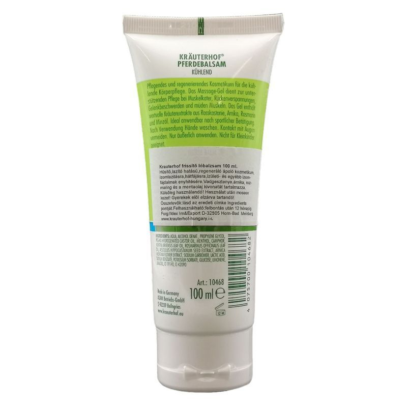 Az árnika, rozmaring, menta, kámfor értékes kivonataival. A Krauterhof Lóbalzsam alkalmas lehet kisebb sportsérülések (húzódások, rándulások, ficamok) kezelésére. Hűsíthet és frissíthet, emellett kellemes izomlazító hatása lehet, az izomláz okozta fájdalmat is csökkentheti. Térd, boka, könyök, csukló, derék, hát izom és ízületi fájdalmai esetén is hatásos lehet. Nem tartalmaz mesterséges színező és szaganyagokat. Kellemes illatú.