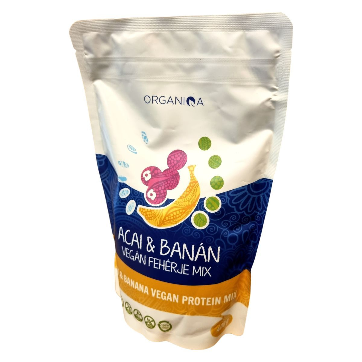 Az Organiqa Acai & Banán Vegán Fehérje Mix egy különleges, 100% bio és vegán fehérje keverék, amely acai és banán ízesítéssel készült. A termék magas fehérjetartalmú, több mint 50%, és nem tartalmaz hozzáadott cukrot, adalékanyagot vagy aromát. Az édesítéshez bio stevia levél őrleményt használtak. Kiváló választás lehet azok számára, akik húsmentesen szeretnék kiegészíteni napi fehérjeszükségletüket, valamint sportolóknak, akik szintetikus szerek nélkül kívánják fejleszteni izmaikat. A termék gluténmentes és szójamentes, és 100% újrahasznosítható tasakban érkezik. Származási helye az EU/nem EU mezőgazdaság, és ellenőrzött ökológiai gazdálkodásból származik.