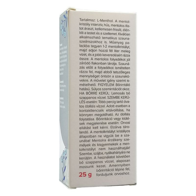A mentolkristály intenzív, hűs, mentolos illatot áraszt, kellemesen frissíti, élénkíti a testet és a szellemet. Kiválóan alkalmazható tematikus szauna showkhoz is.