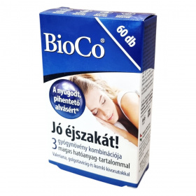 A BioCo Jó éjszakát! étrend-kiegészítő tabletta három gyógynövény kivonatát magas hatóanyag-tartalommal egyesíti: macskagyökér (Valeriana officinalis L.), golgotavirág (Passiflora incarnata) és komló (Humulus lupulus L.). A termék kis méretű, könnyen nyelhető, 9 mm átmérőjű tablettákból áll, amelyek kettős adagja megfelel 1500 mg Valeriana, 800 mg golgotavirág és 800 mg komló száraz növényi őrleménynek. A macskagyökér hozzájárulhat a pihentető, nyugodt alváshoz és a normál idegállapot fenntartásához stresszes vagy túlterhelt életmód esetén. A komló és golgotavirág elősegítheti az egészséges alvást, a relaxációt és a lelki egyensúly megtartását. A termék magyar fejlesztésű és gyártású, a hatóanyagok ugyan nem Magyarországról származnak, azonban a gyártás és fejlesztés kizárólag Magyarországon történik. A BioCo Magyarország Kft. ISO 22000 szabvány és Jó Gyártási Gyakorlat (GMP) irányelvek szerint tanúsított élelmiszerbiztonsági rendszert működtet. A terméket vegán, laktózmentes, gluténmentes és színezékmentes változatban kínálják.