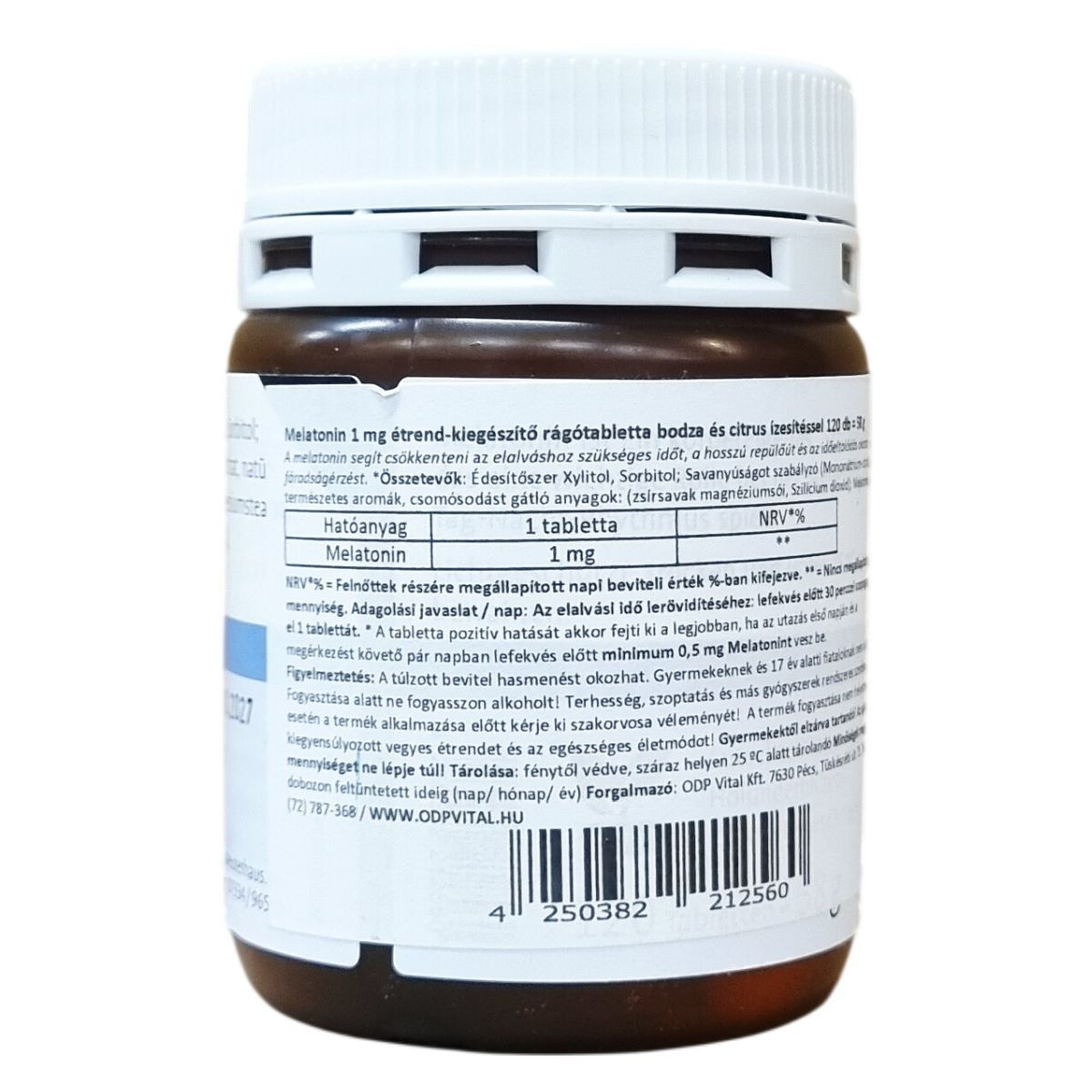 Szopogató tabletta melatoninnal és édesítőszerekkel. 1 tabletta 1 mg melatonint tartalmaz. NRV%: nincs megállapított napi beviteli referenciaérték. Kiszerelés: 120 db tabletta. Németországban gyártva.