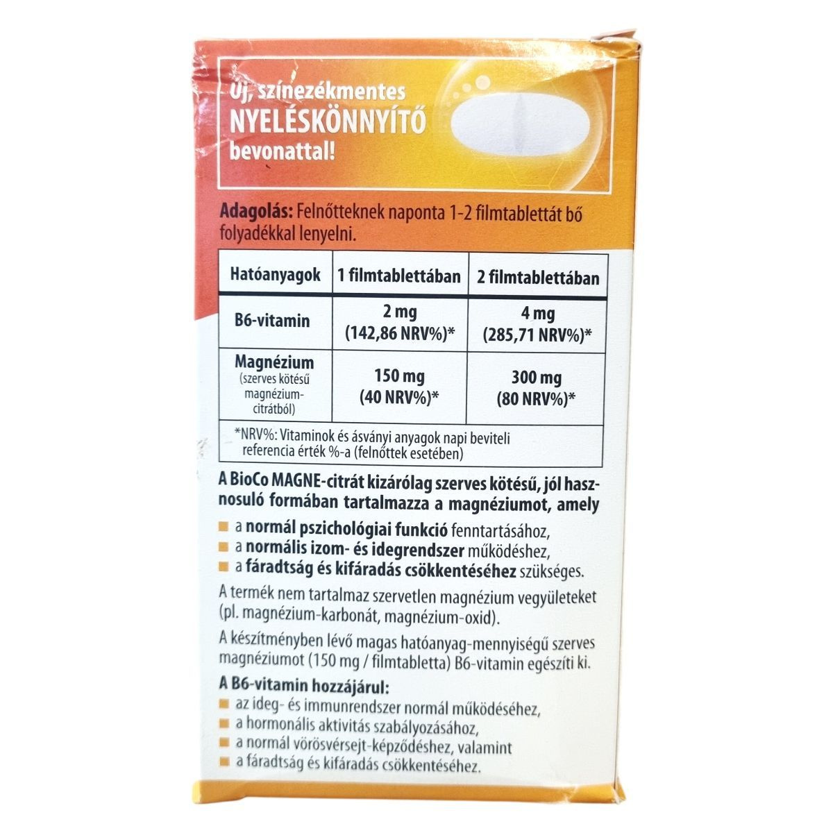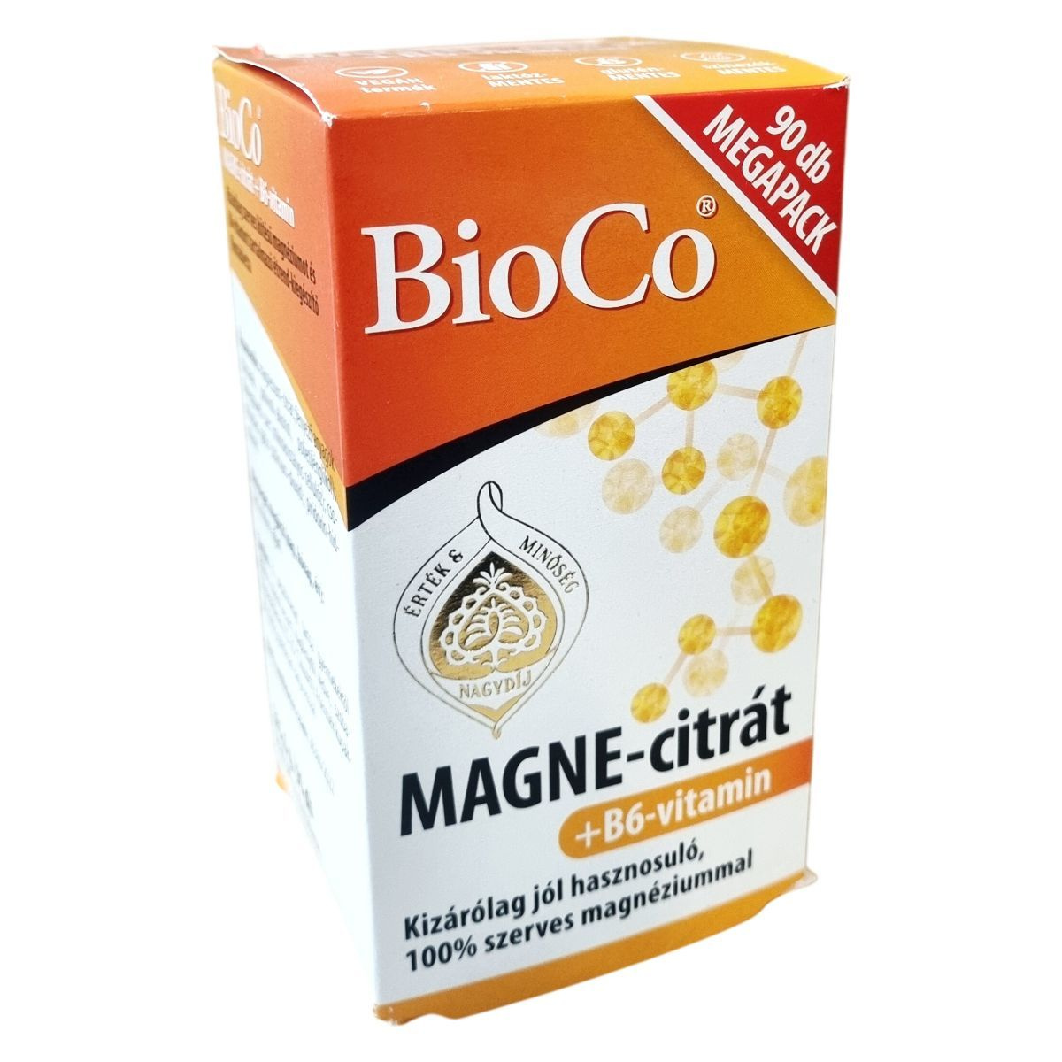 A BioCo MAGNE-citrát + B6-vitamin kizárólag szerves kötésű magnéziumot és B6-vitamint tartalmazó étrend-kiegészítő filmtabletta. A magnézium jól hasznosuló formában van jelen a termékben, kizárva a szervetlen magnézium vegyületeket, mint a magnézium-karbonát vagy magnézium-oxid. A B6-vitamin a magnézium hatását kiegészíti azzal, hogy hozzájárulhat az ideg- és immunrendszer normál működéséhez, a hormonális aktivitás szabályozásához, a normál vörösvérsejt-képződéshez, valamint a fáradtság és kifáradás csökkentéséhez. A termék vegán és nem tartalmaz laktózt, glutént vagy színezékeket. Magyar fejlesztésű és gyártású, amelynek hatóanyagai nem Magyarországról származnak. Az új, színezékmentes nyeléskönnyítő bevonat segítheti a tabletta könnyebb lenyelését. A termék 90 darab, egyenként 1,84 g-os filmtablettát tartalmaz, összes tömege 165,6 g. A „BioCo” bejegyzett cégnevet jelöl, nem ökológiai tanúsítást. Az ISO 22000 és GMP előírásoknak megfelelően gyártott termék magas minőségi és élelmiszerbiztonsági színvonalat képvisel.