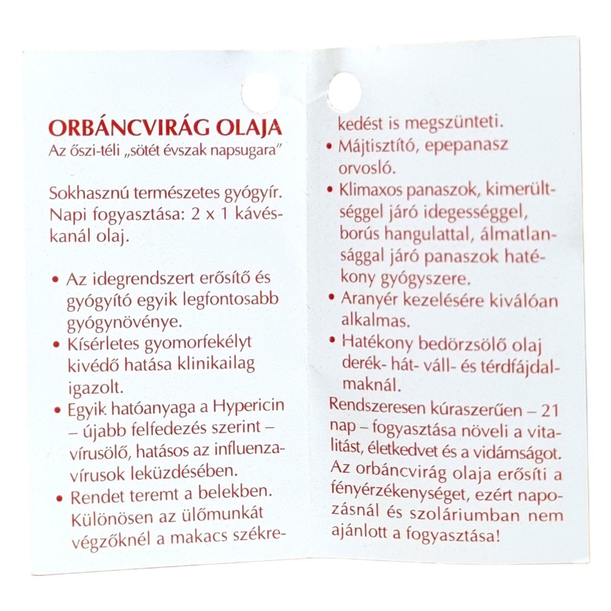 Az orbáncvirágolaj, más néven Oleum Hypericin Flos, egy sokoldalú gyógynövénykivonat, amely fájdalomcsillapító, hangulatjavító, masszírozó és bedörzsölő hatású lehet. Az idegrendszer erősítésében és gyógyításában játszhat szerepet, valamint kísérletes gyomorfekélyt kivédő hatása klinikailag igazolt. A Hypericin hatóanyag vírusölő tulajdonságokkal bírhat, különösen az influenzavírusok ellen. Az olaj rendet teremthet a belekben, különösen az ülőmunkát végzőknél segíthet a makacs székrekedés megszüntetésében. Májtisztító és epepanasz orvosló hatása is lehet. Klimaxos panaszok, kimerültséggel járó idegesség, borús hangulat és álmatlanság esetén is hatékony lehet. Aranyér kezelésére is kiválóan alkalmas, és hatékony bedörzsölő olajként szolgálhat derék-, hát-, váll- és térdfájdalmak esetén. Rendszeres, kúraszerű – 21 napos – fogyasztása növelheti a vitalitást, életkedvet és vidámságot.