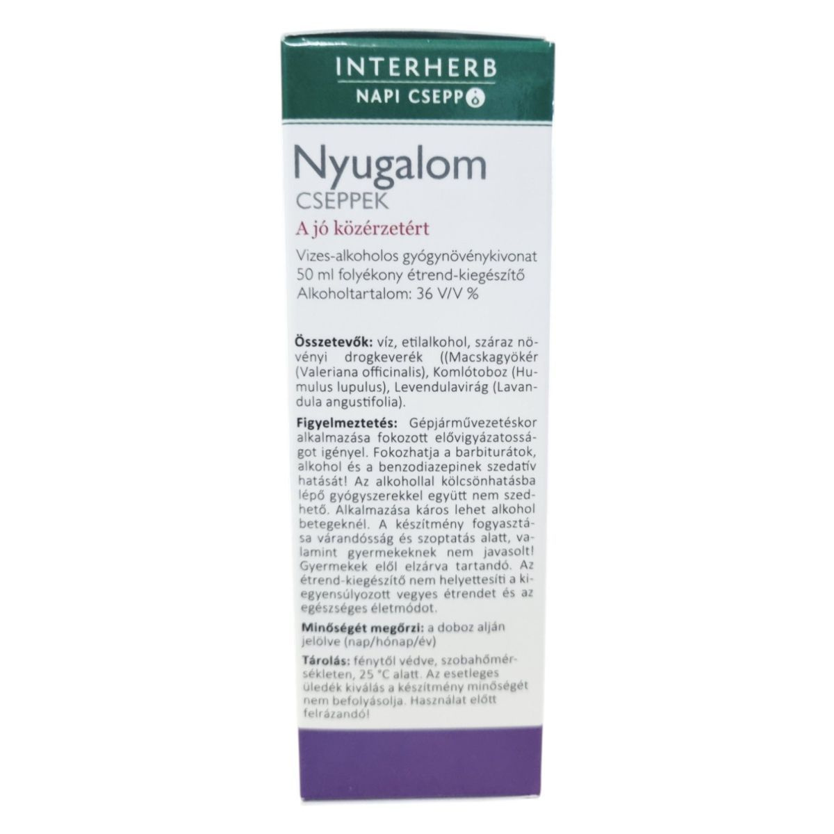 Az INTERHERB NAPI CSEPP Nyugalom CSEPPEK egy vizes-alkoholos gyógynövénykivonat, amely 50 ml-es kiszerelésben kapható. Az alkoholtartalma 36 V/V %. A termék macskagyökér, komlótoboz és levendulavirág kivonatát tartalmazza, amelyek hozzájárulhatnak a mentális és fizikai jólét fenntartásához, valamint a nyugodt, pihentető alváshoz. A napi adag 2 ml kivonatnak felel meg, amely 400 mg gyógynövény drogból készül. A termék használata során fontos a figyelmeztetések betartása, különösen gépjárművezetéskor és bizonyos gyógyszerek szedése esetén.