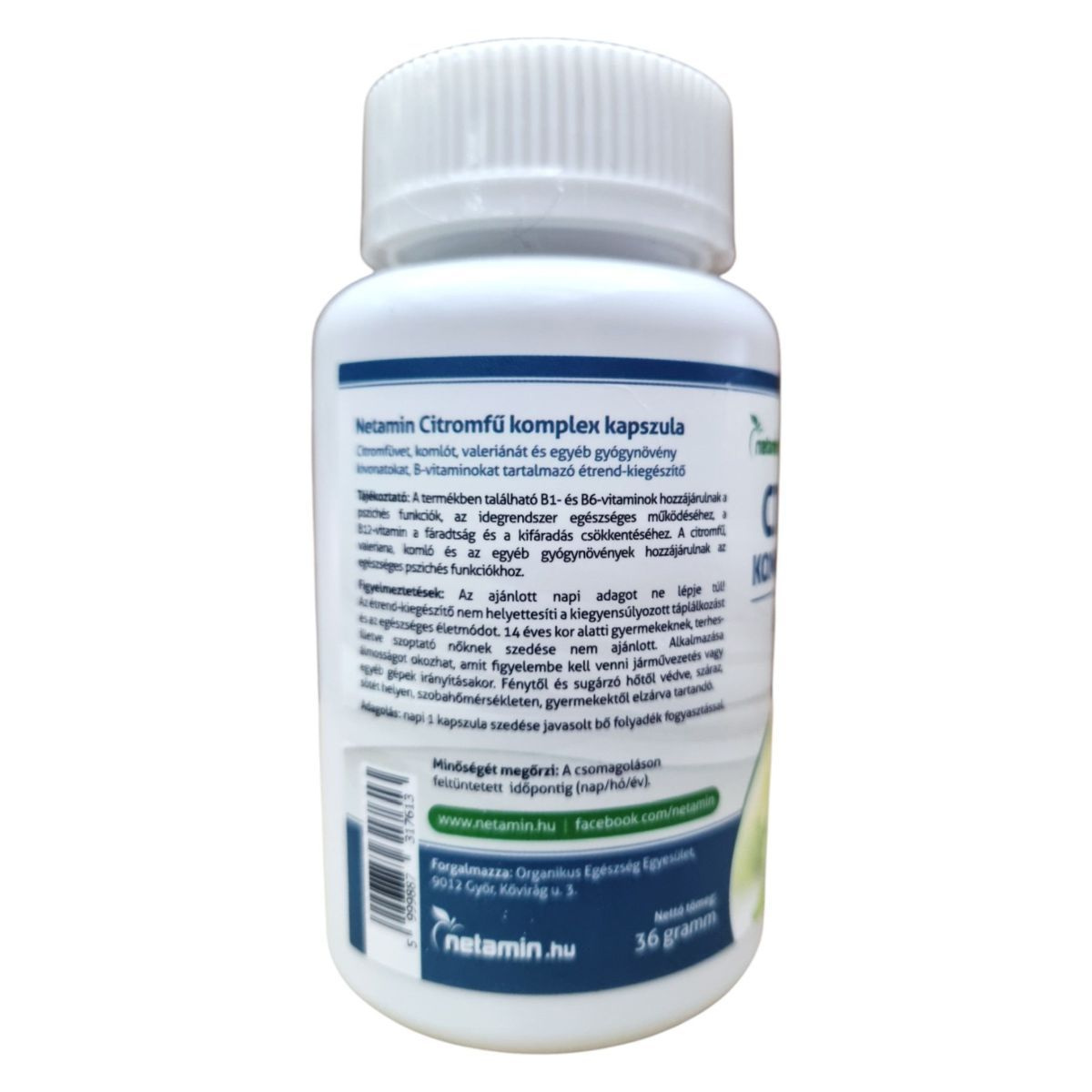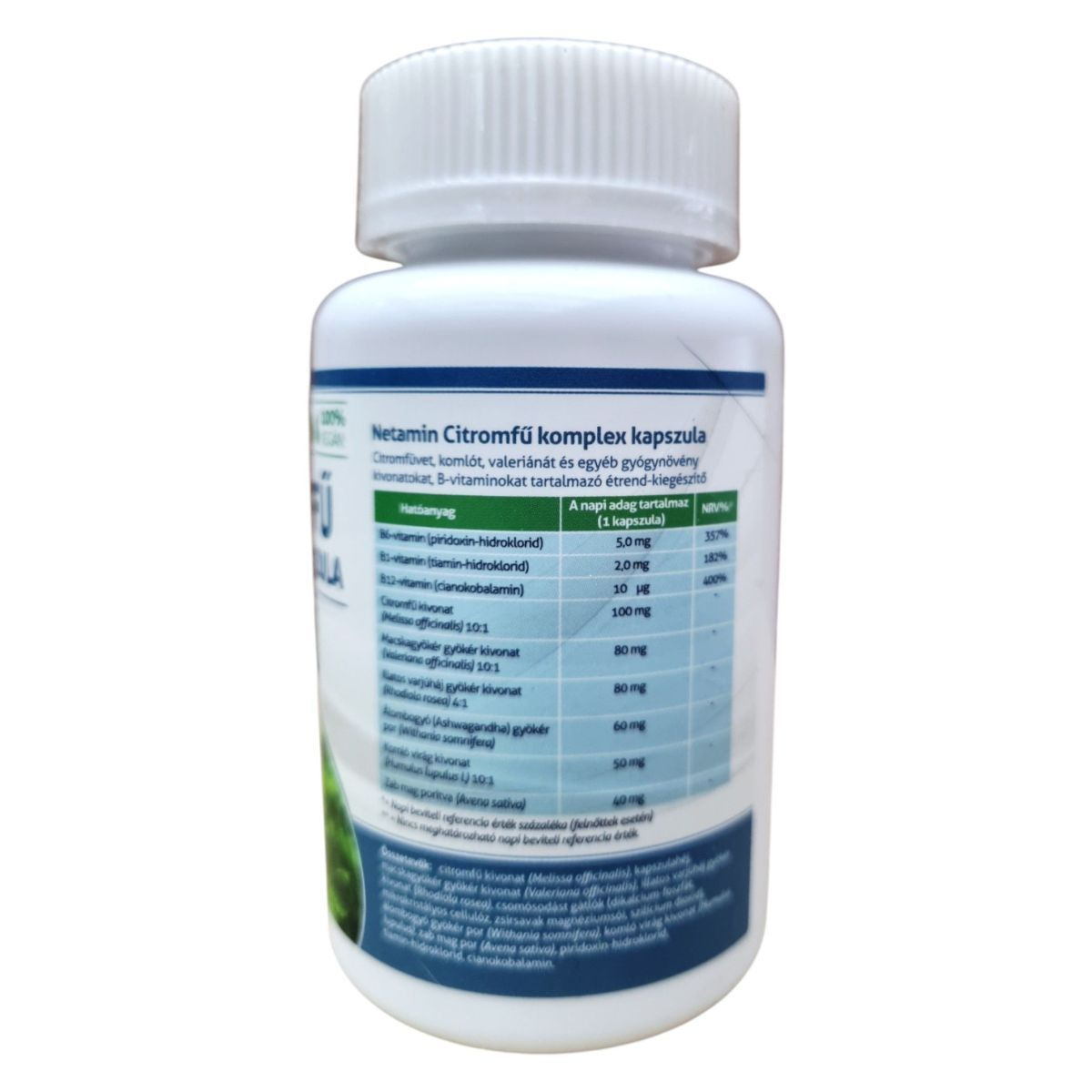 A Netamin Citromfű komplex kapszula egy 100% vegán étrend-kiegészítő, amely citromfüvet, komlót, valeriánát és más gyógynövény kivonatokat, valamint B-vitaminokat tartalmaz. A termék célja, hogy támogassa a nyugodt és kiegyensúlyozott pszichés funkciókat. A B1- és B6-vitaminok hozzájárulhatnak az idegrendszer egészséges működéséhez, míg a macskagyökér és a varjúháj a fáradtság csökkentéséhez járulhat hozzá. A termék használata előtt javasolt orvosi konzultáció, különösen terhesség, szoptatás vagy 14 éves kor alatti gyermekek esetén.